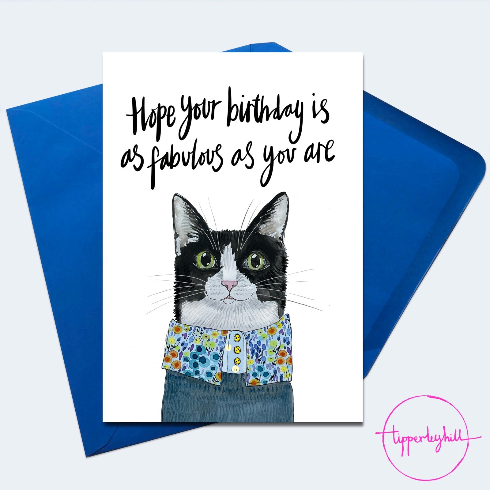 Each greetings"Hope your birthday is a fabulous as you are" greetings card comes with a 5” x 7” blue envelope wrapped in bio cello. The card inside is left blank to write your own message. These cards are created by both Abi and Roz. Abi paints the animal and Roz paints the colourful patterns.
