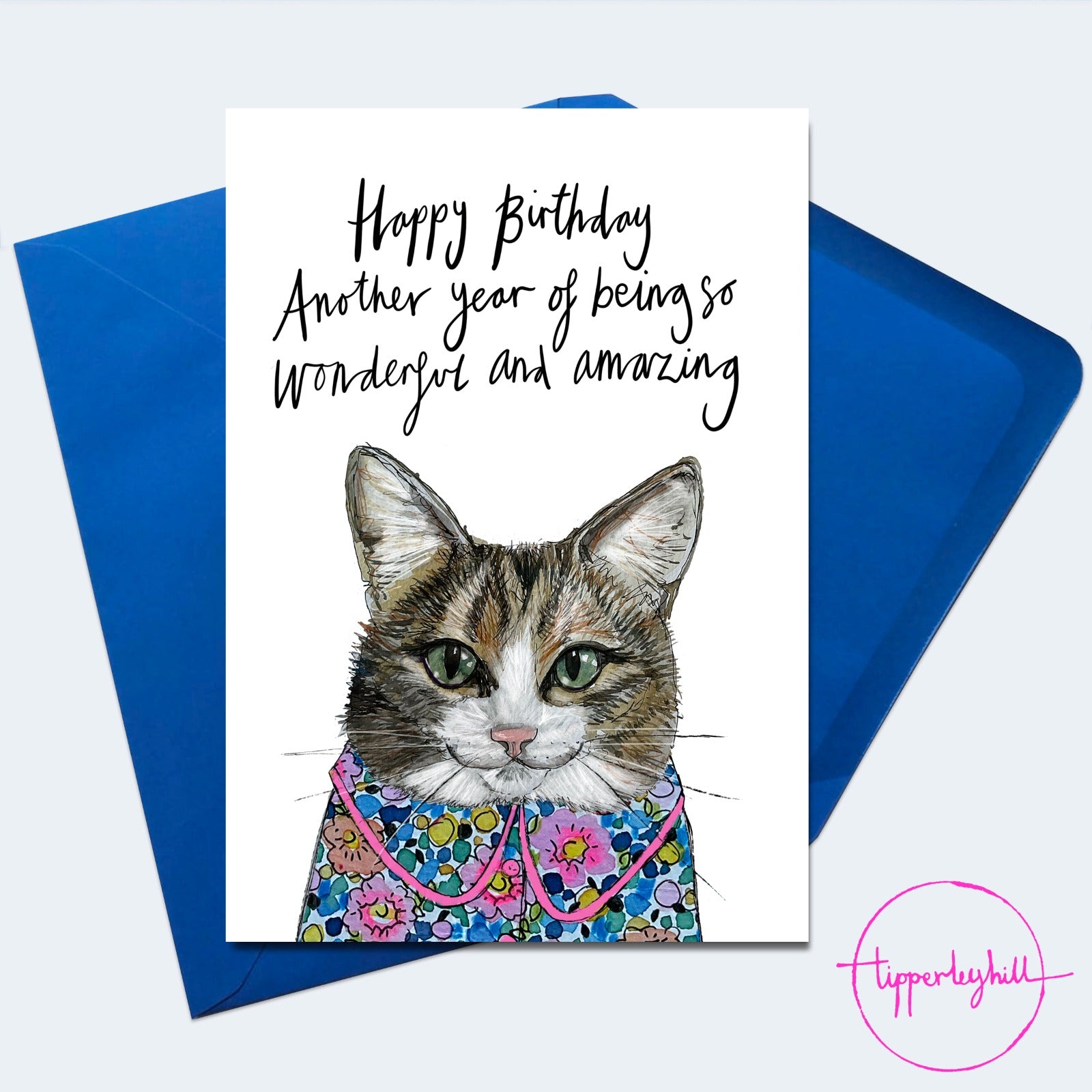 Each "Happy Birthday Another year of being so wonderful and amazing" greetings card comes with a 5” x 7” blue envelope wrapped in bio cello. The card inside is left blank to write your own message. These cards are created by both Abi and Roz. Abi paints the animal and Roz paints the colourful patterns.