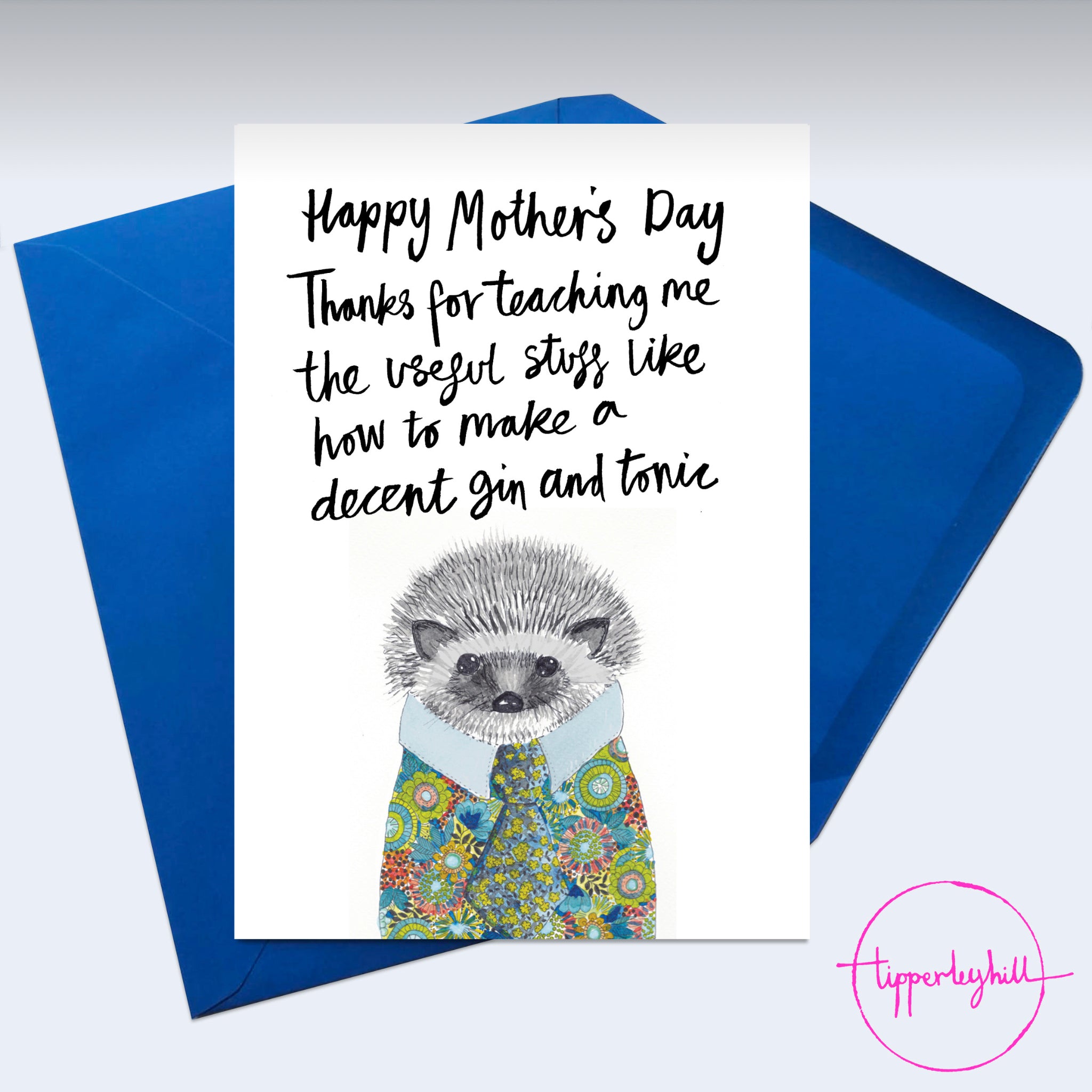 Card, AS47TEACH, Horrace hedgehog, ‘Happy Mothers Day. Thanks for teaching me the useful stuff like how to make a decent gin and tonic