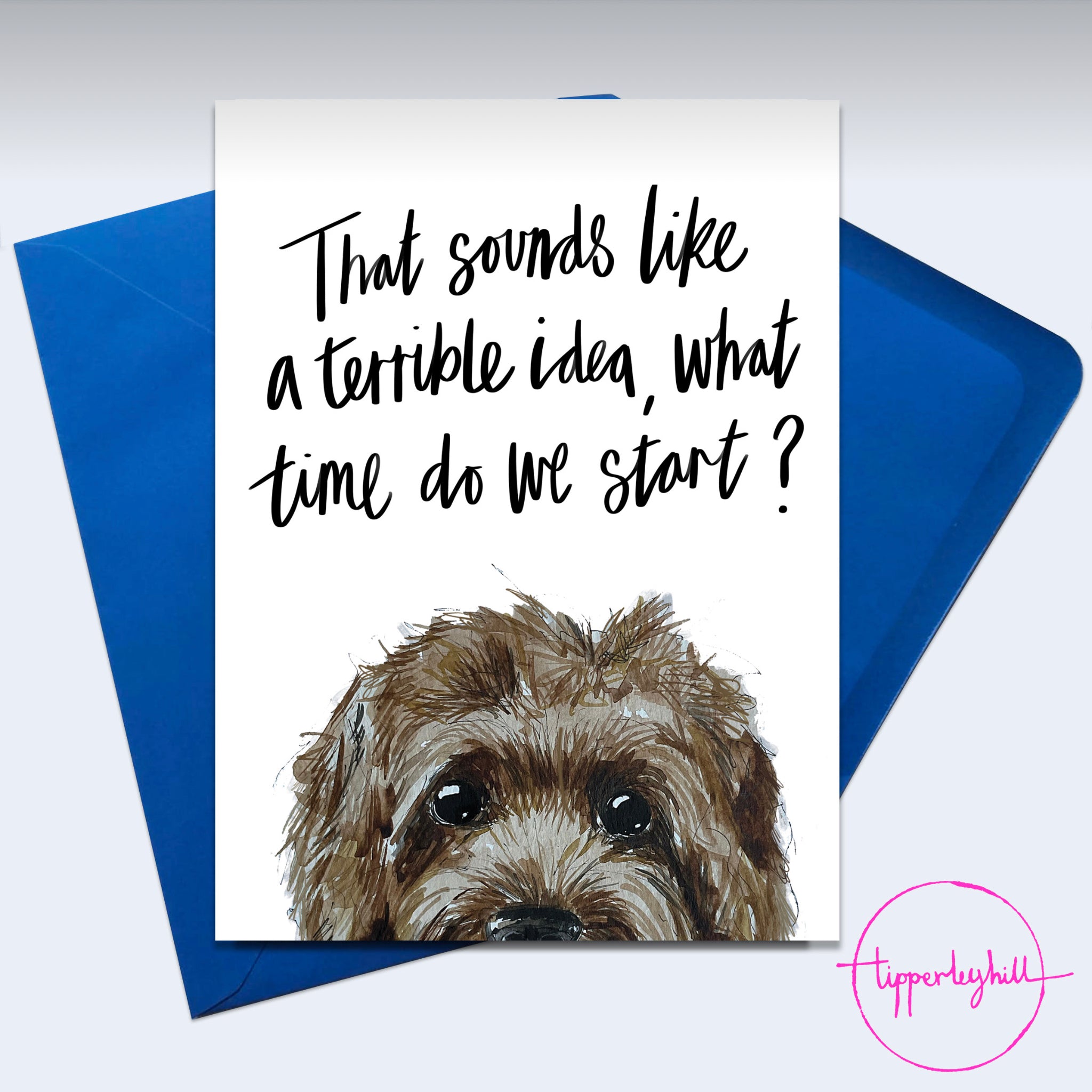 Each Cockerpoo eyes, ‘That sounds like a terrible idea, what time do we start?’ greetings card comes with a 5” x 7” blue envelope wrapped in bio cello. The card inside is left blank to write your own message.