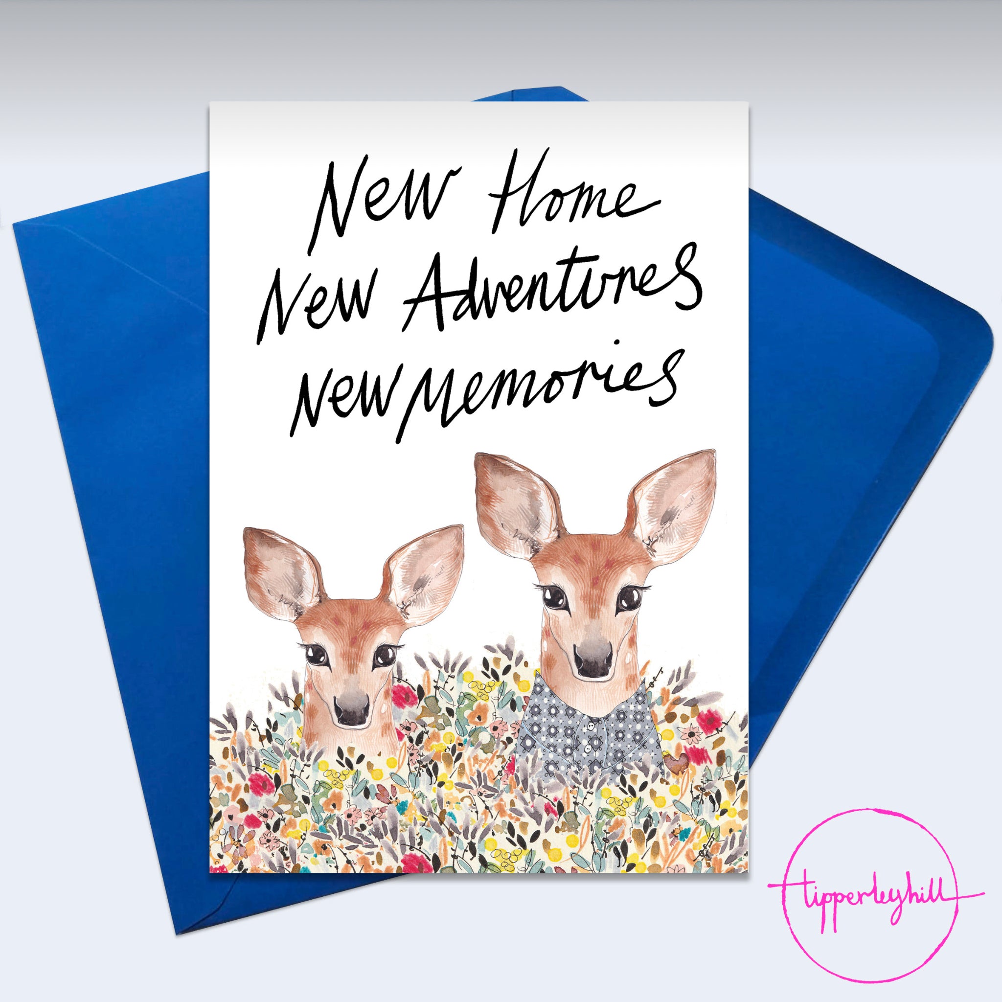 Each deer card, ‘New home, new adventures, new memories’ greetings card comes with a 5” x 7” blue envelope wrapped in bio cello. The card inside is left blank to write your own message.