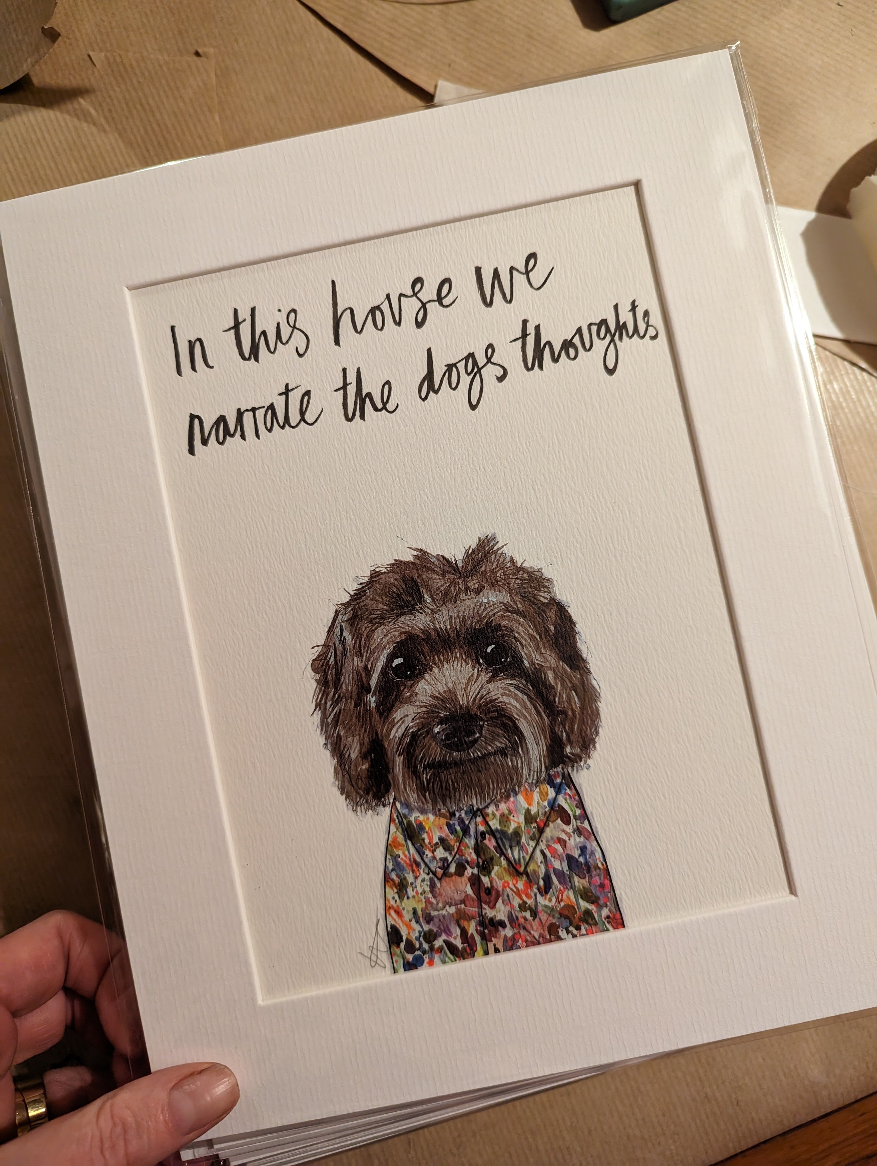 This collection of animals in shirts are giclée prints of original watercolour illustrations. Abi paints the animals and sends them to Roz in London to get their shirts fitted. All prints begin plain, but Abi can personalise any animal with your choice of phrase or quote, hand written in brush pen calligraphy witch Indian ink. Please type the phrase you want written on your print in the personalised message box.