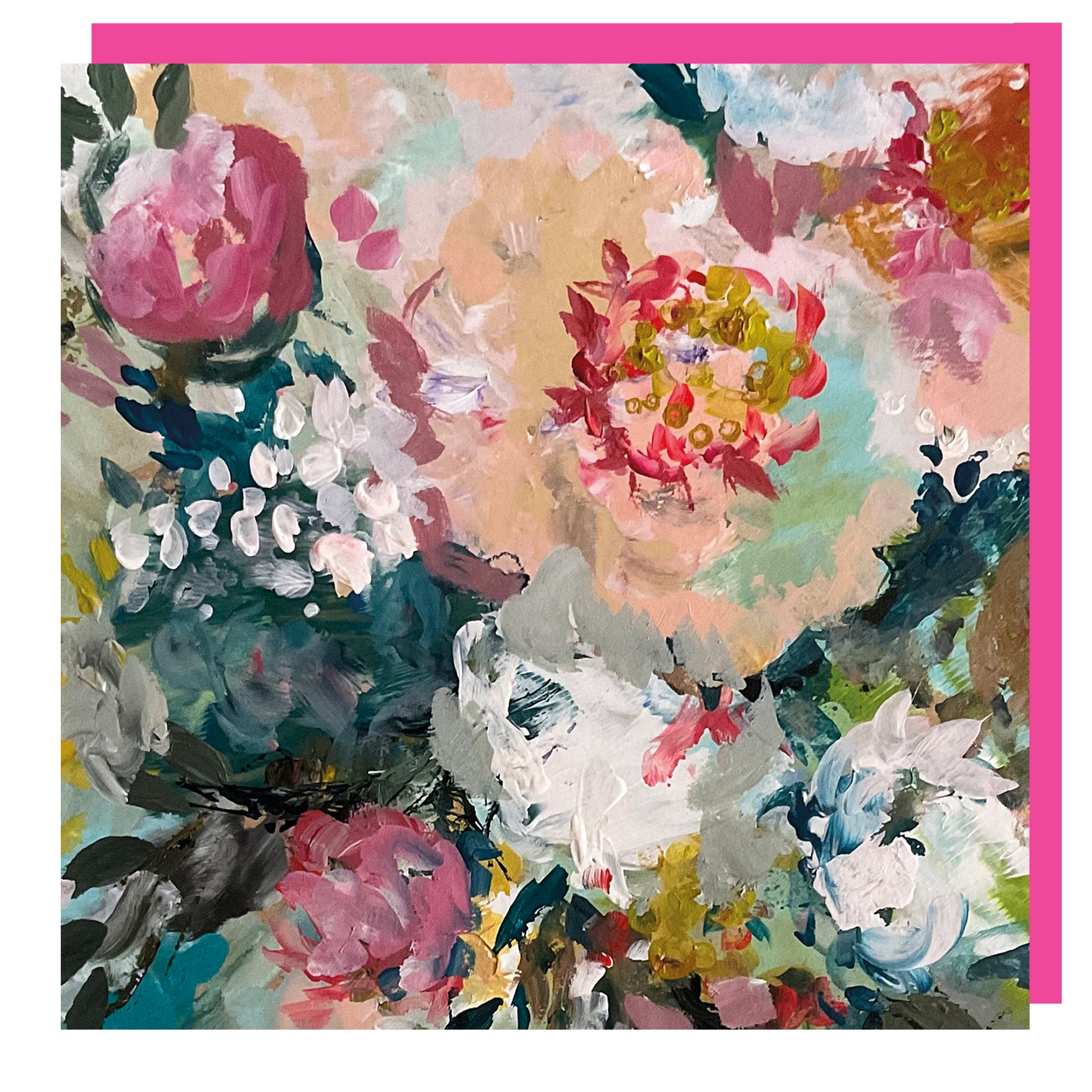 Each floral greetings card (15 x 15cm) comes with a pink envelope wrapped in cellophane. The card inside is left blank to write your own message.