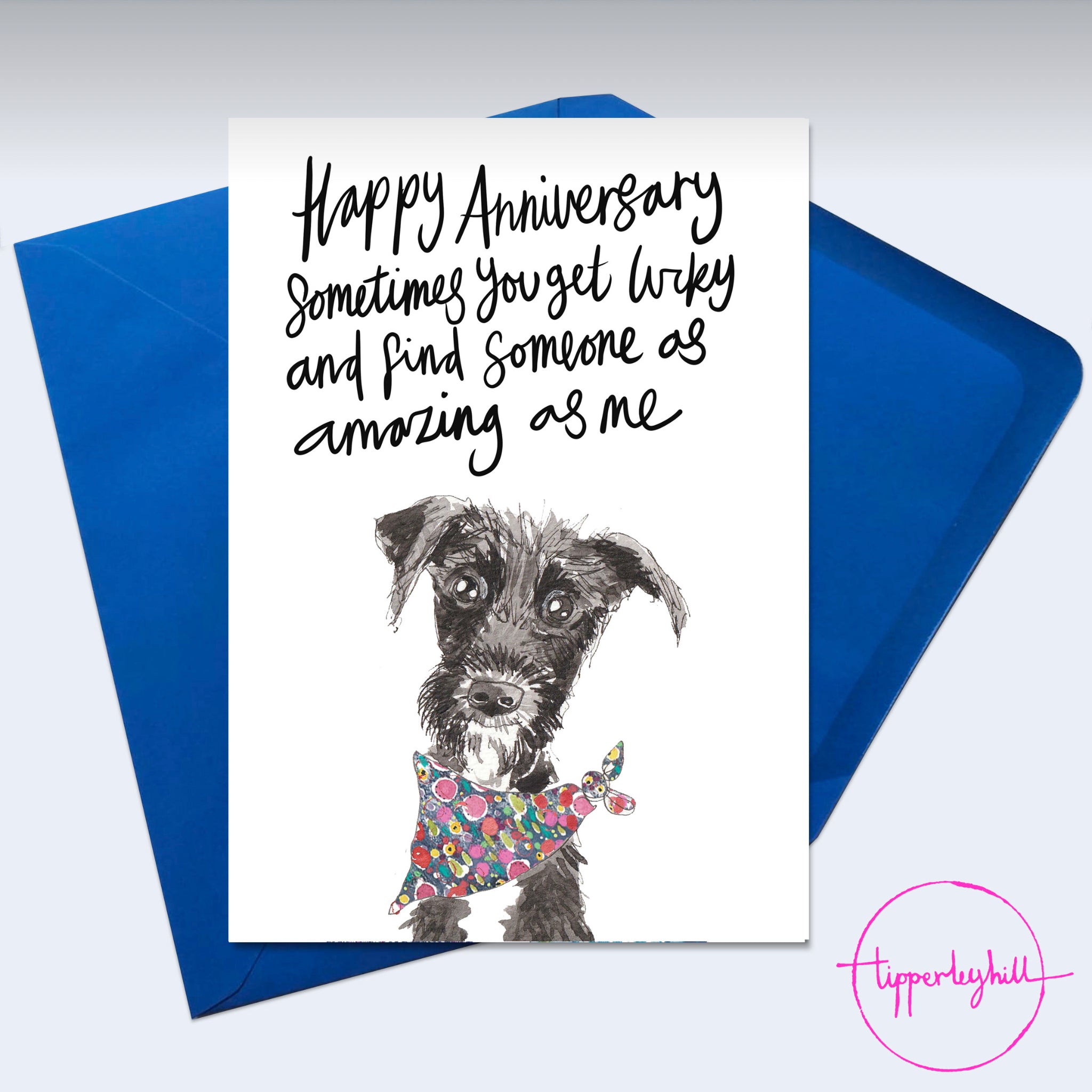 Card, AS90ANNI, scruffy dog, ‘Happy anniversary. Sometimes you get lucky and find someone as amazing as me’