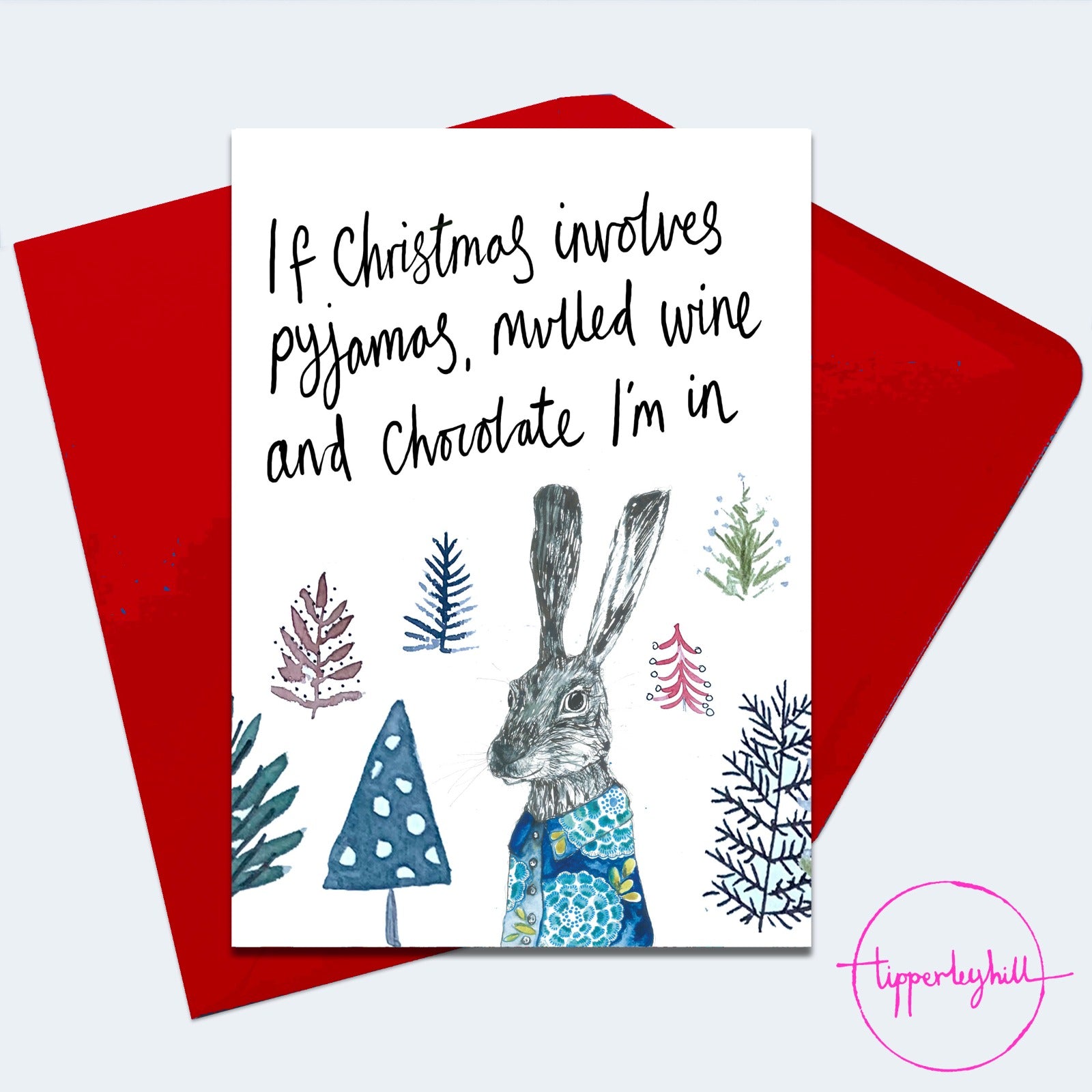 Christmas Card, XMAS02, Hare Christmas card, ‘If Christmas involves pyjamas, mulled wine and chocolate, I’m in’