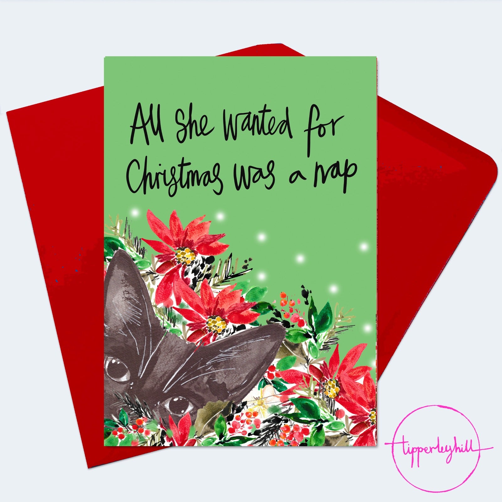 Christmas Card, XMAS11, Black cat Christmas card, ‘All she wanted for Christmas was a nap’