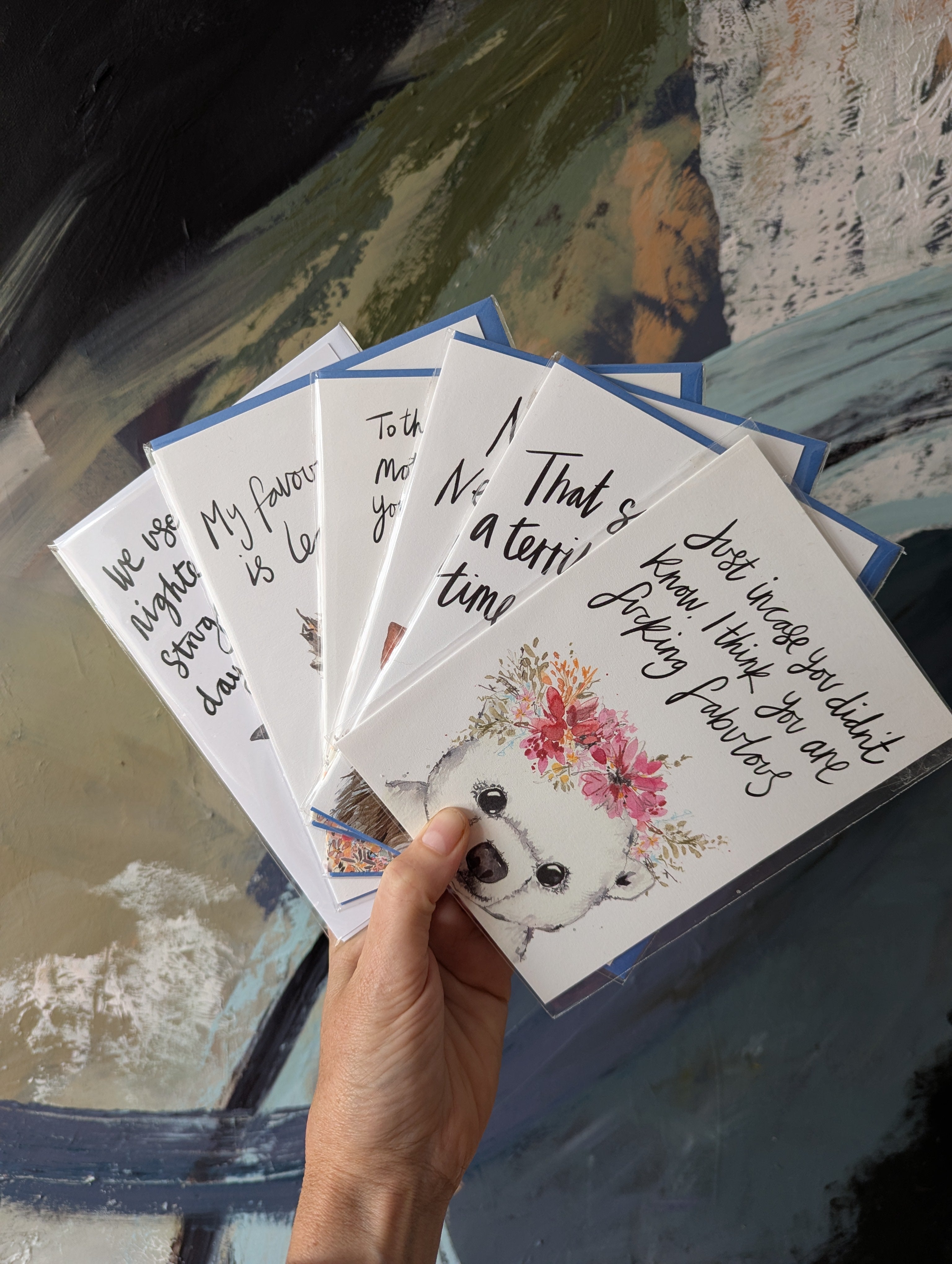 For a limited time, we are offing a lucky dip of 6 random cards (worth £3 per card). All cards from our animal in shirts range. This bundle will include swearing. Please note you cannot choose the cards, these will be selected at random, but will all be different.