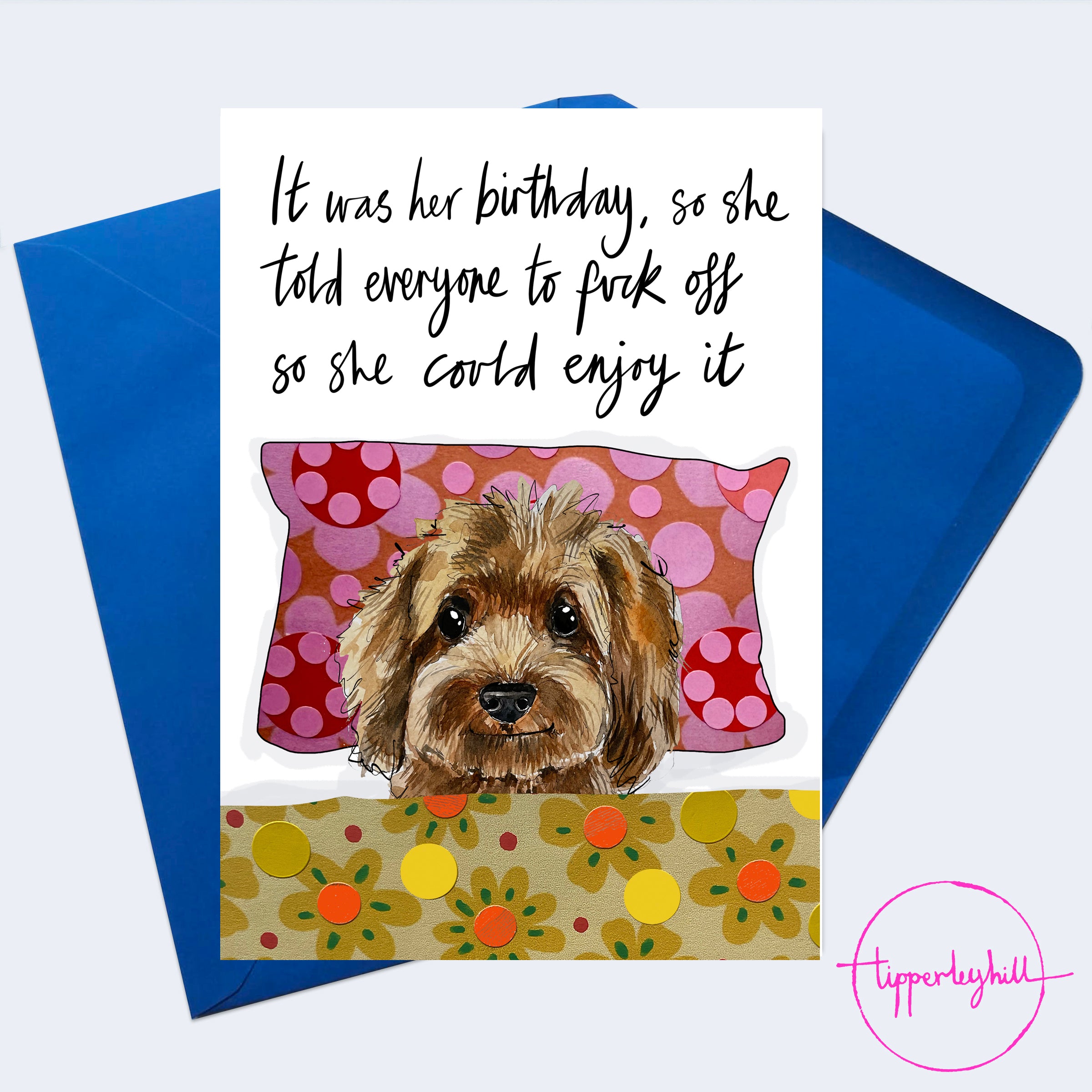 Card reads ‘It was her birthday, so she told everyone to f==k off so she could enjoy it' greetings card comes with a 5” x 7” blue envelope wrapped in bio cello. The card inside is left blank to write your own message.