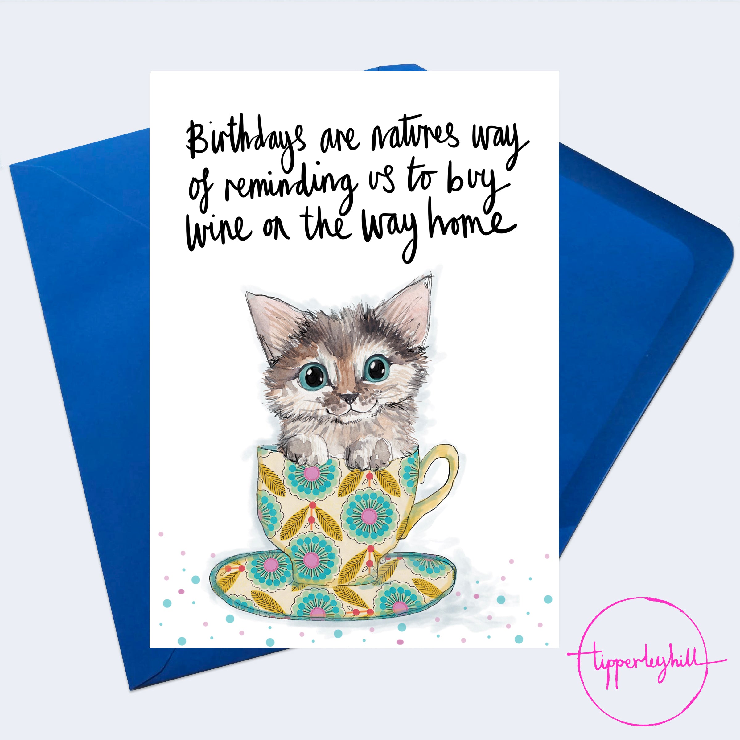 Card reads ‘Birthday's are natures way of reminding us to buy wine on the way home' greetings card comes with a 5” x 7” blue envelope wrapped in bio cello. The card inside is left blank to write your own message.