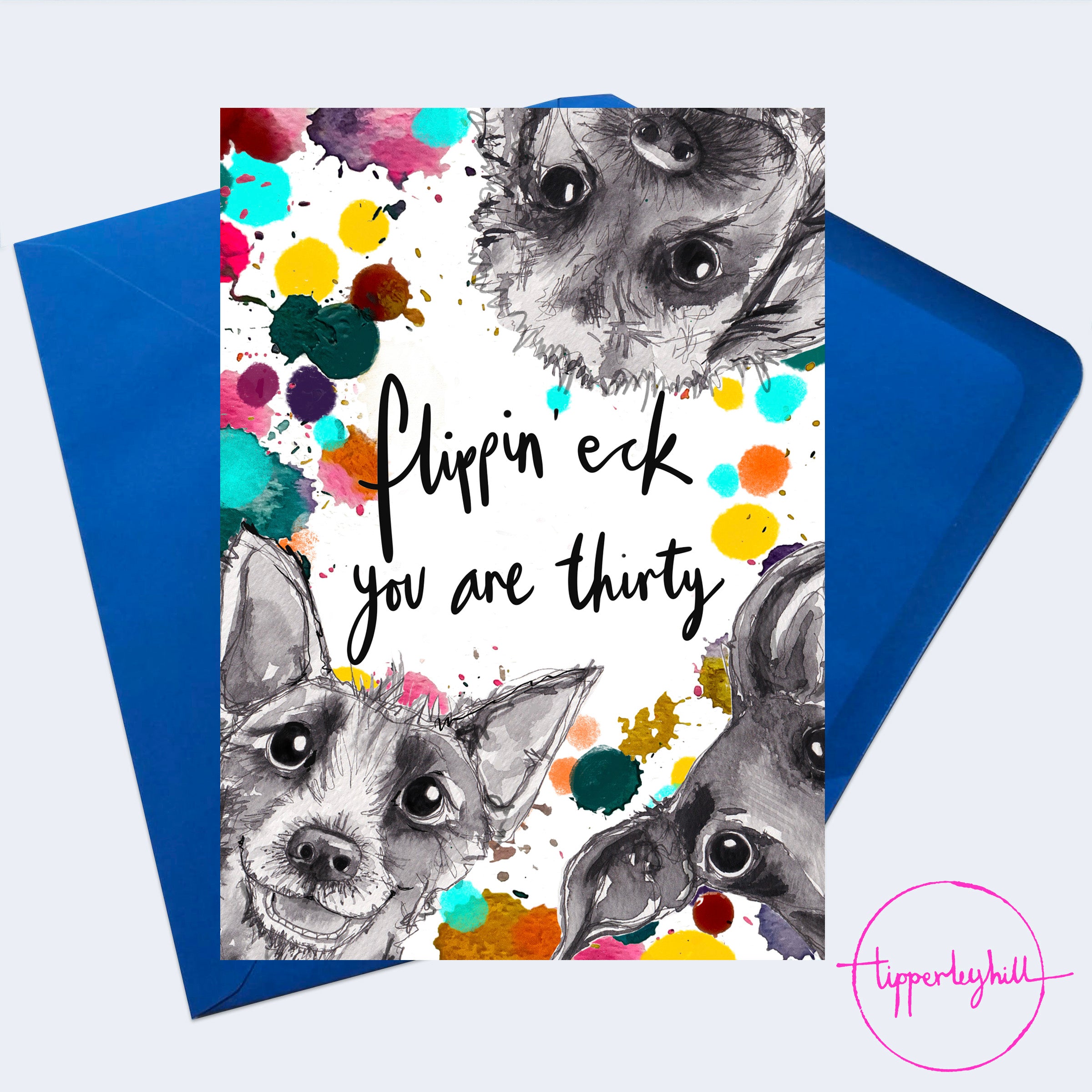Each, ‘Flippin' ek you are thirty’ greetings card comes with a 5” x 7” blue envelope wrapped in bio cello. The card inside is left blank to write your own message.