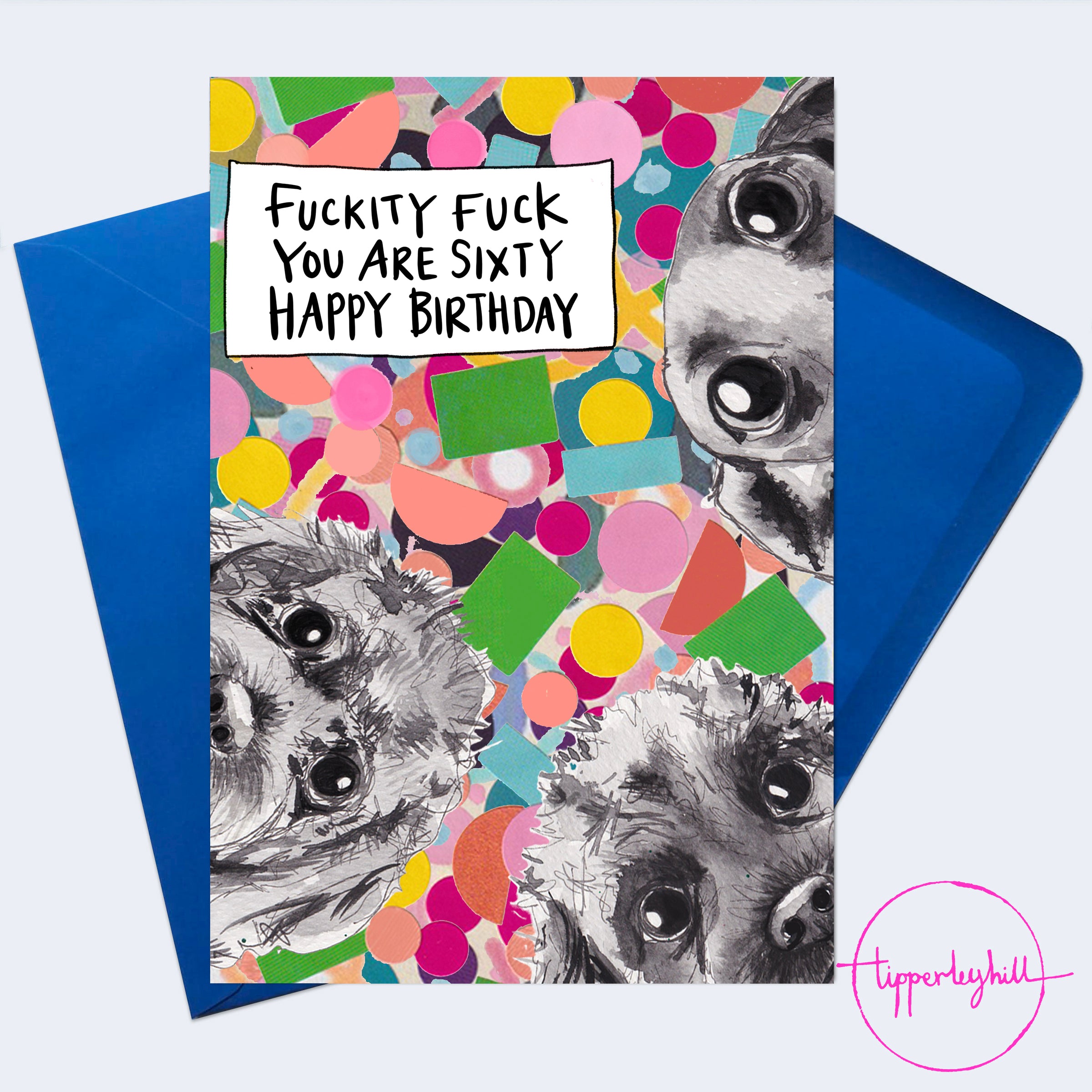 Each, ‘Oh fu*kity fu*k you are sixty Happy Birthday’ greetings card comes with a 5” x 7” blue envelope wrapped in bio cello. The card inside is left blank to write your own message.