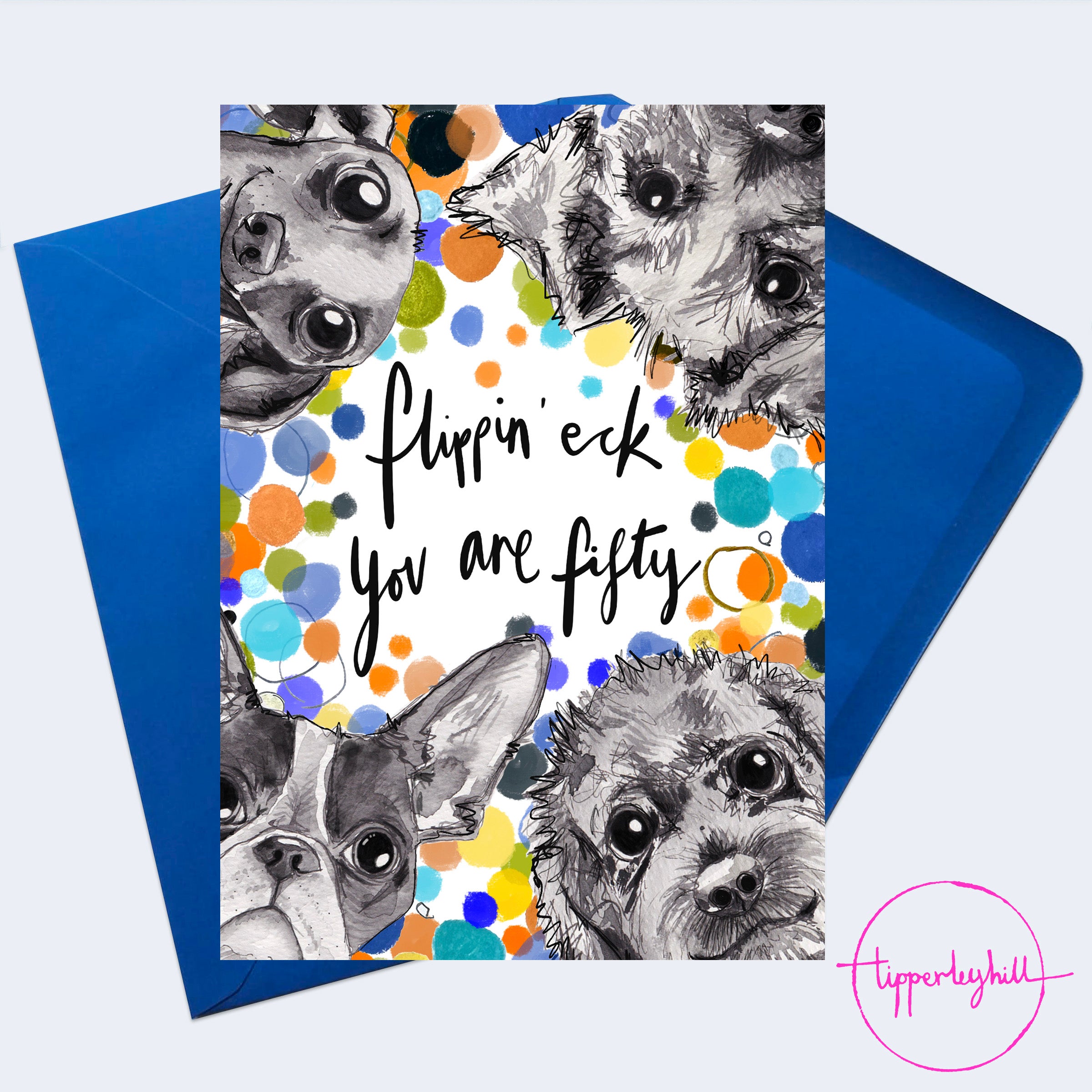 Each, ‘Flippin' eck you are fifty’ greetings card comes with a 5” x 7” blue envelope wrapped in bio cello. The card inside is left blank to write your own message.