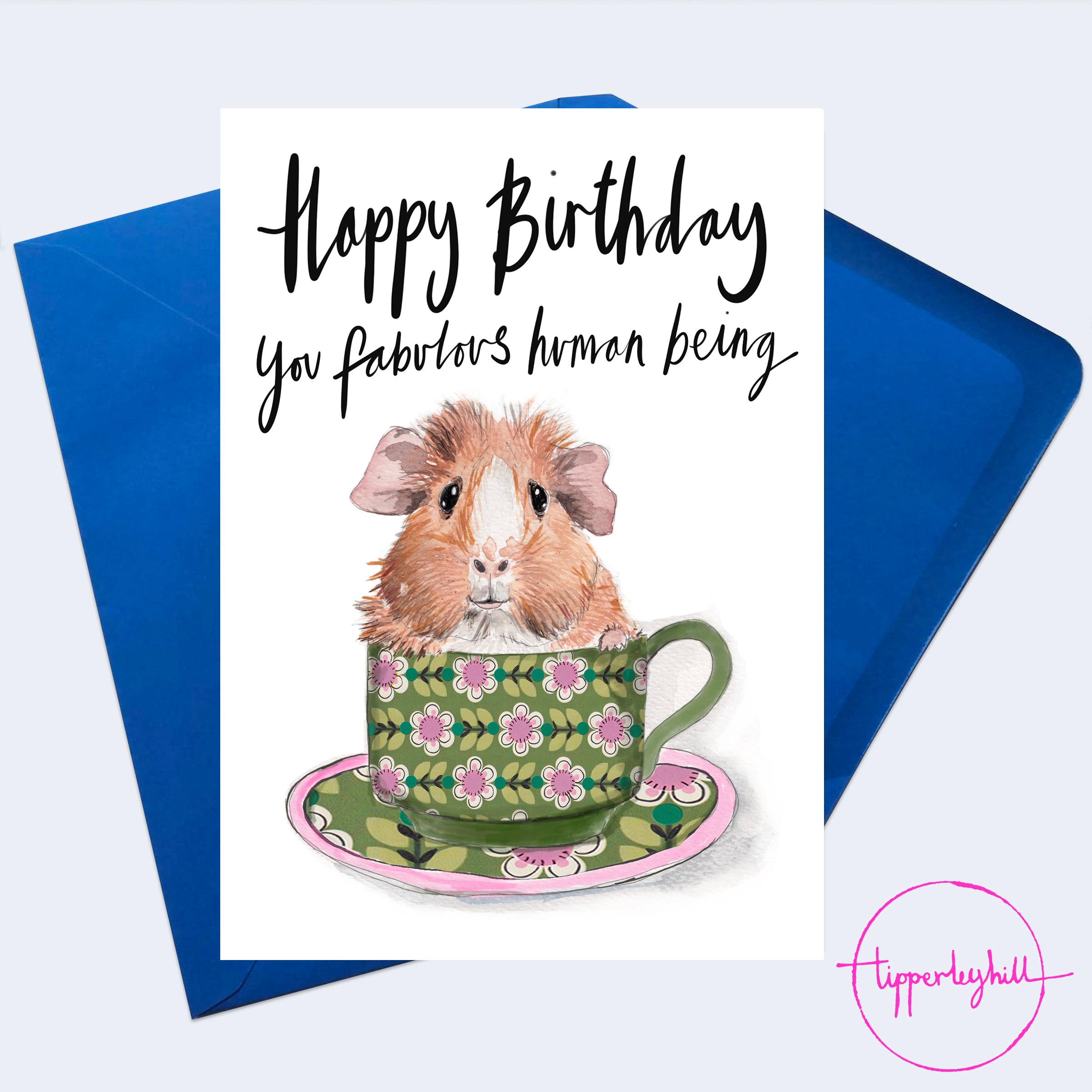 Card reads ‘Happy Birthday you fabulous human’ greetings card comes with a 5” x 7” blue envelope wrapped in bio cello. The card inside is left blank to write your own message.