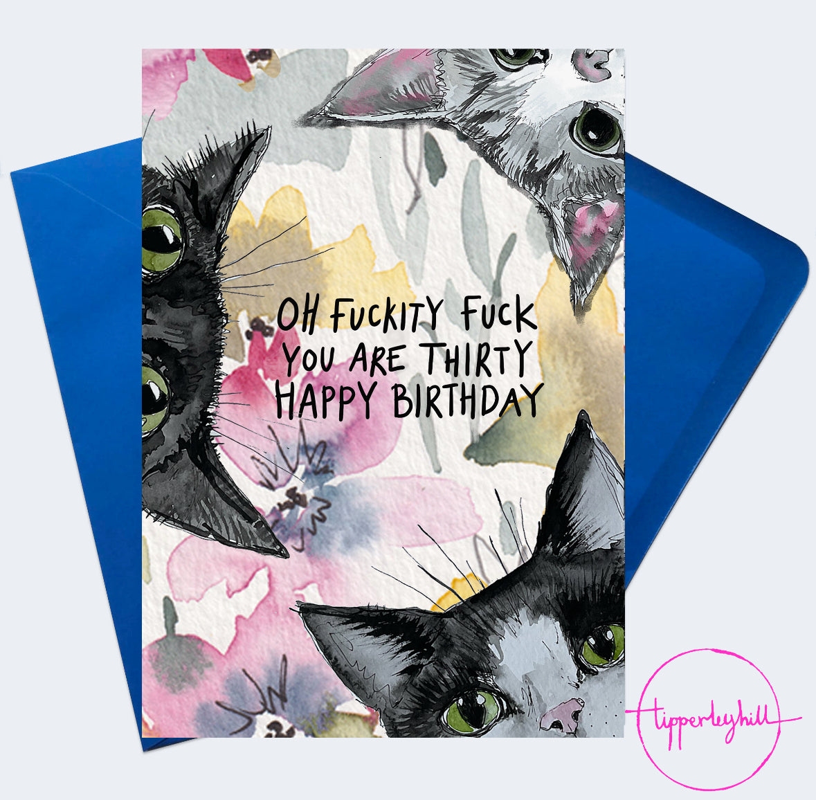 Each, ‘Oh f**kity f**k you are thirty Happy Birthday’ greetings card comes with a 5” x 7” blue envelope wrapped in bio cello. The card inside is left blank to write your own message.