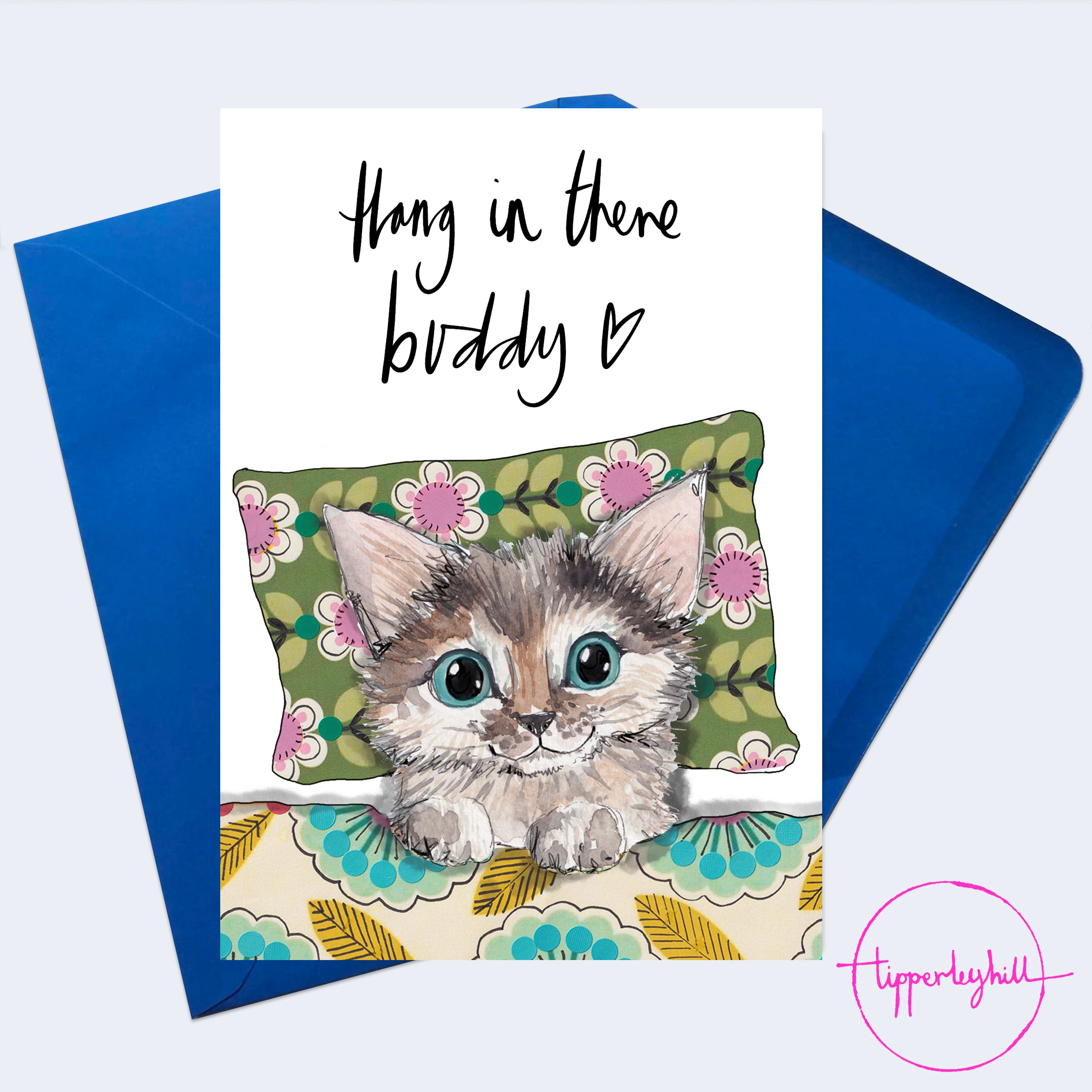 Card reads ‘Hang in there buddy’ greetings card comes with a 5” x 7” blue envelope wrapped in bio cello. The card inside is left blank to write your own message.