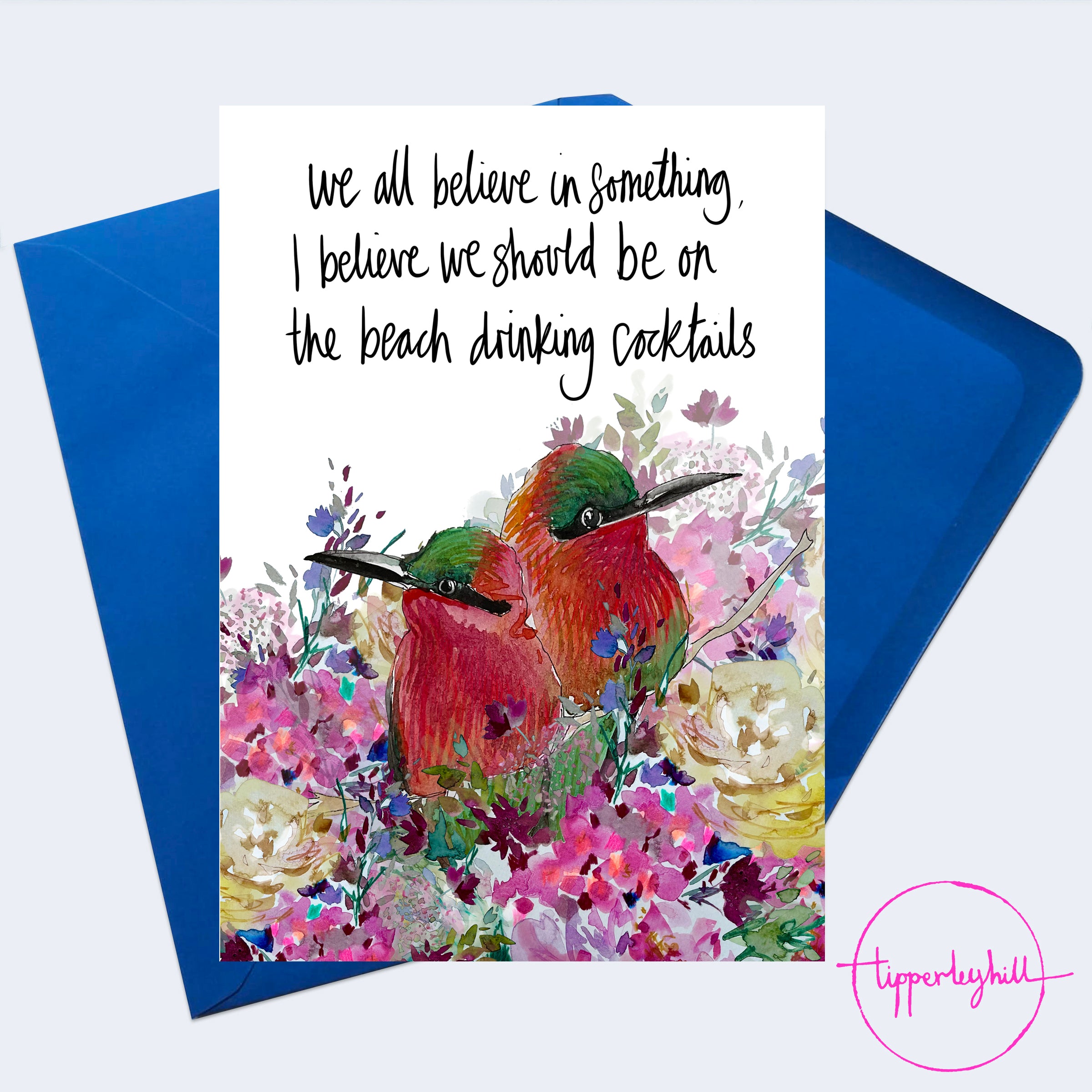 Card reads ‘We all believe in something, I believe we should be on the beach drinking cocktails' This greetings card comes with a 5” x 7” blue envelope wrapped in bio cello. The card inside is left blank to write your own message.