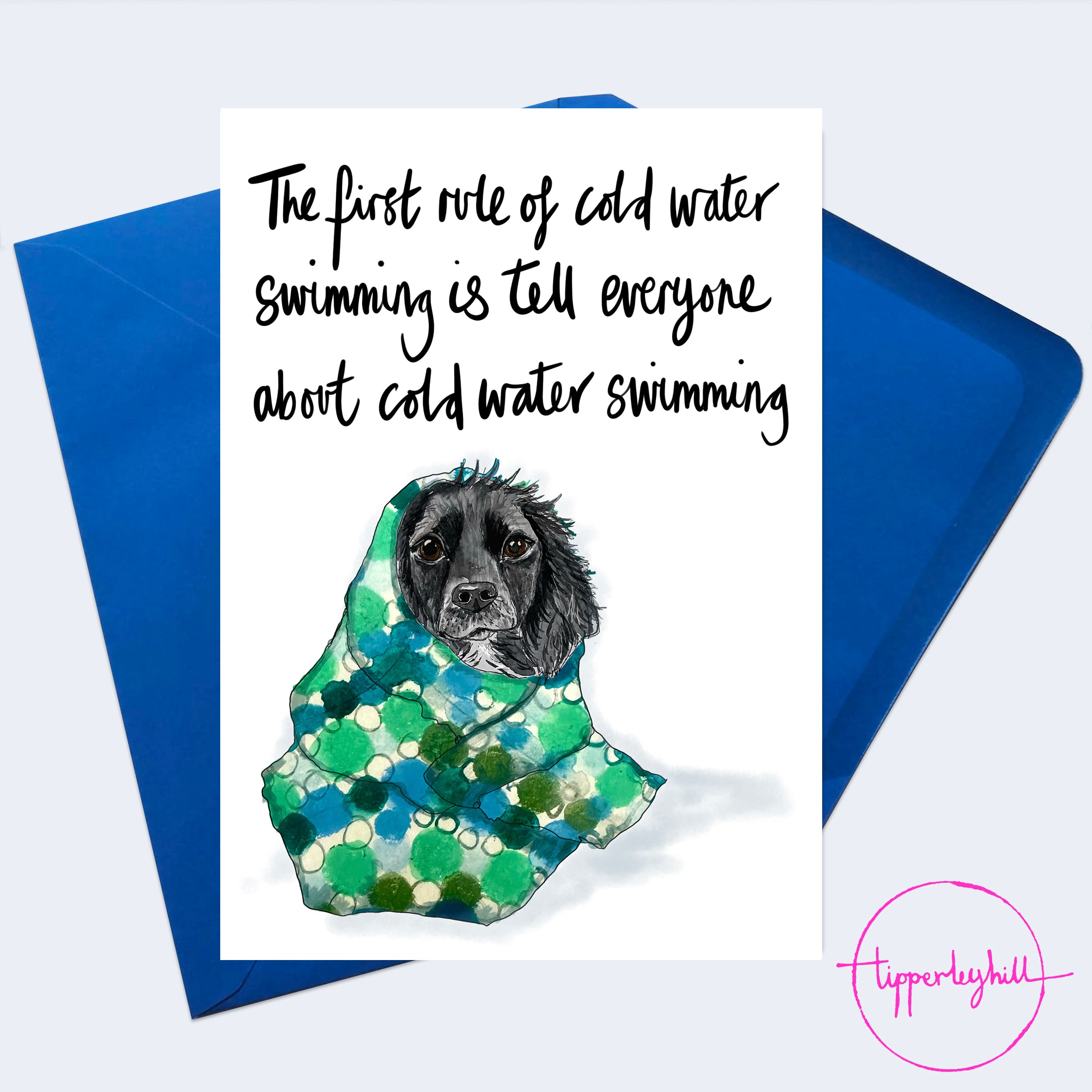 Card reads ‘The first rule of cold water swimming is tell everyone about cold water swimming’ greetings card comes with a 5” x 7” blue envelope wrapped in bio cello. The card inside is left blank to write your own message.