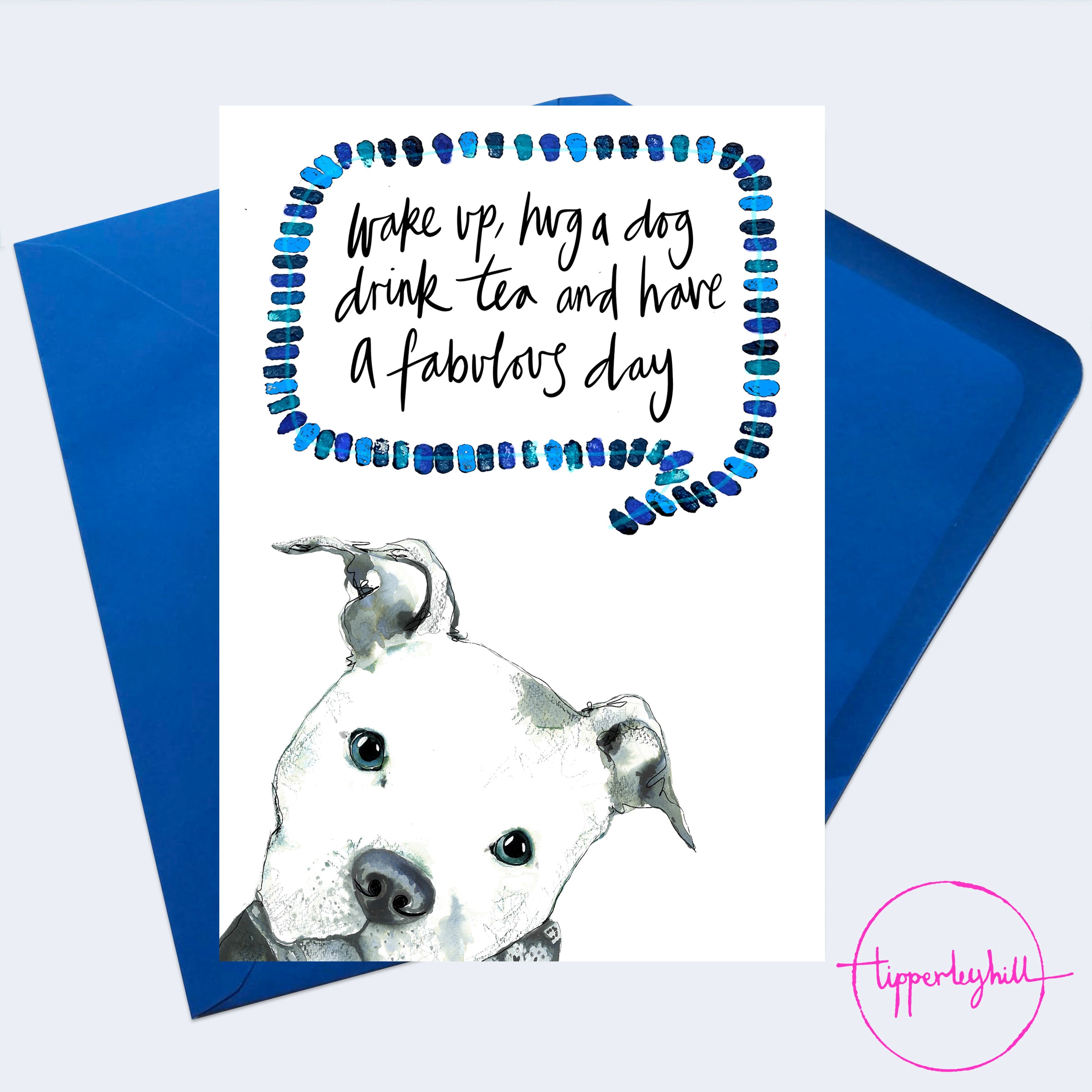 Card reads ‘Wake up, hug a dog, drink tea and have a fabulous day' greetings card comes with a 5” x 7” blue envelope wrapped in bio cello. The card inside is left blank to write your own message.