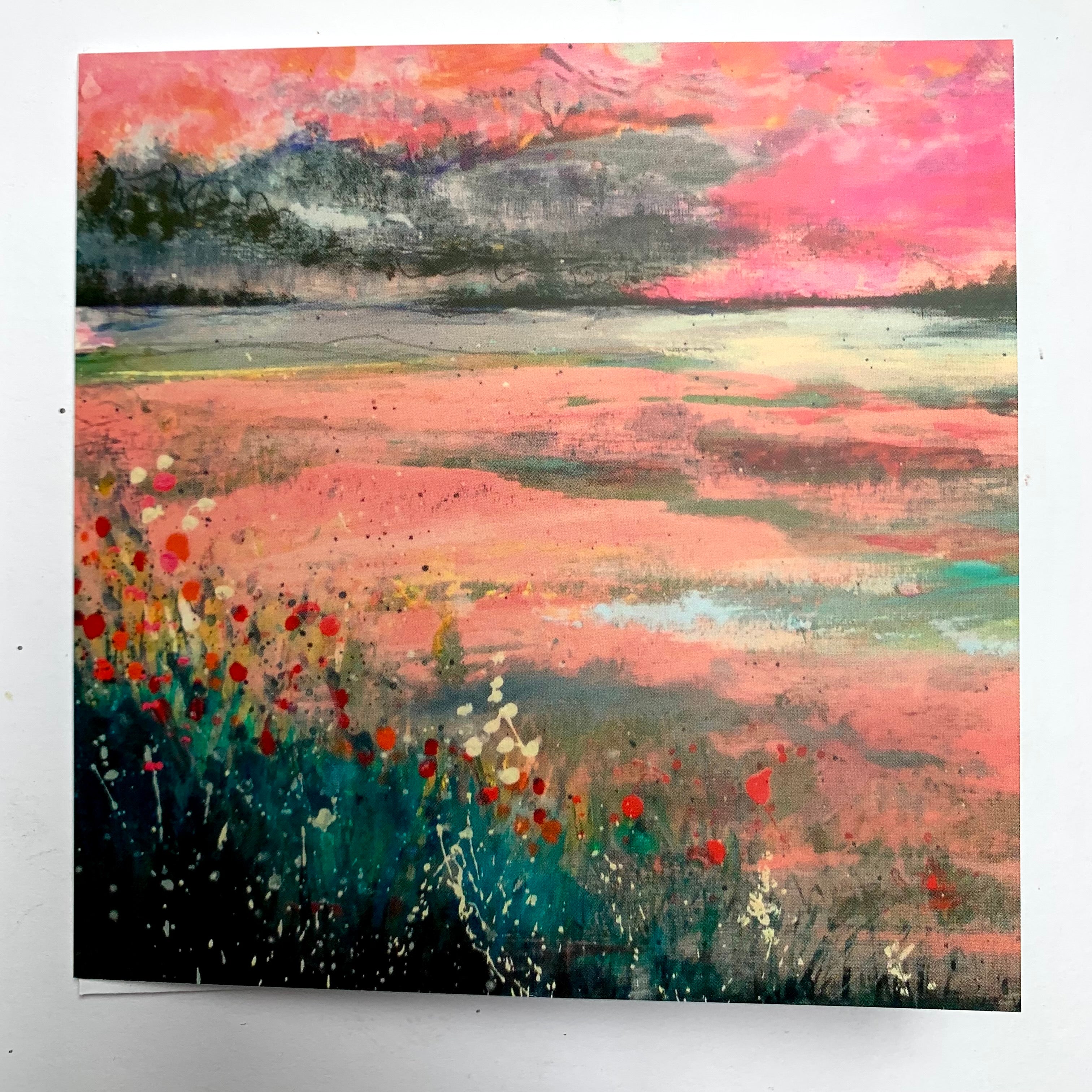 Each abstract landscape greetings card (15 x 15cm) comes with a white envelope wrapped in biodegradable cellophane. The card inside is left blank to write your own message.