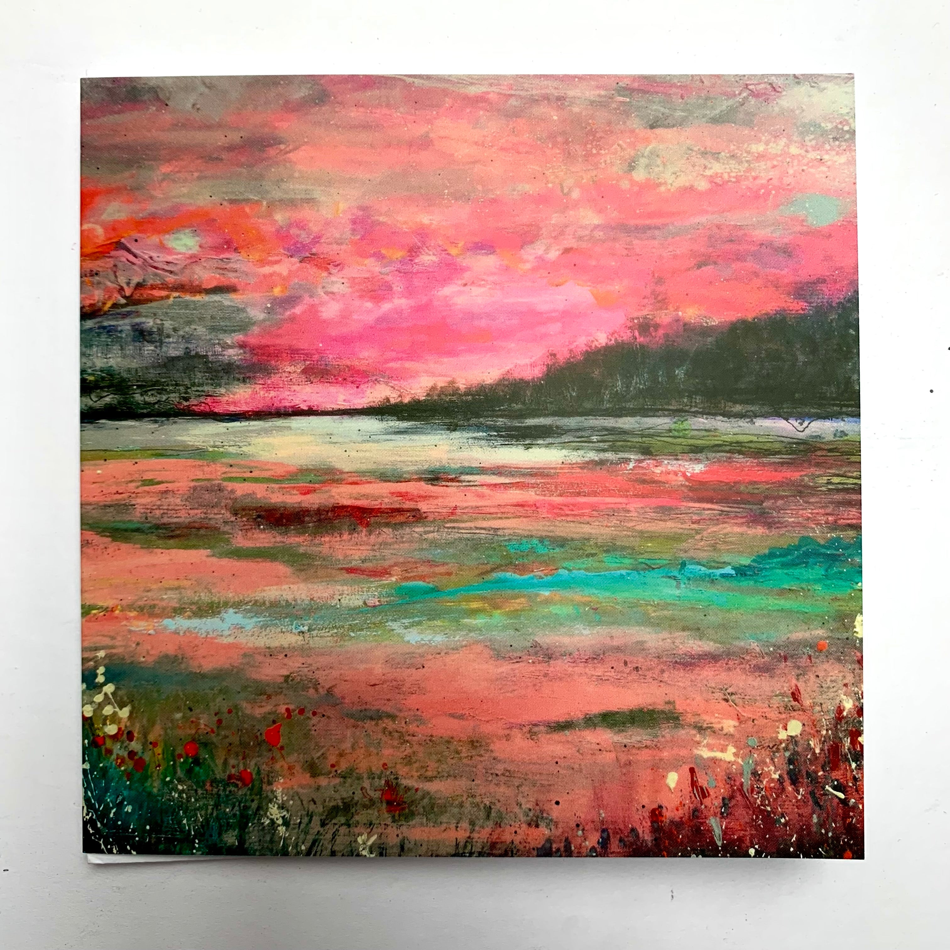 Each abstract landscape greetings card (15 x 15cm) comes with a white envelope wrapped in biodegradable cellophane. The card inside is left blank to write your own message.