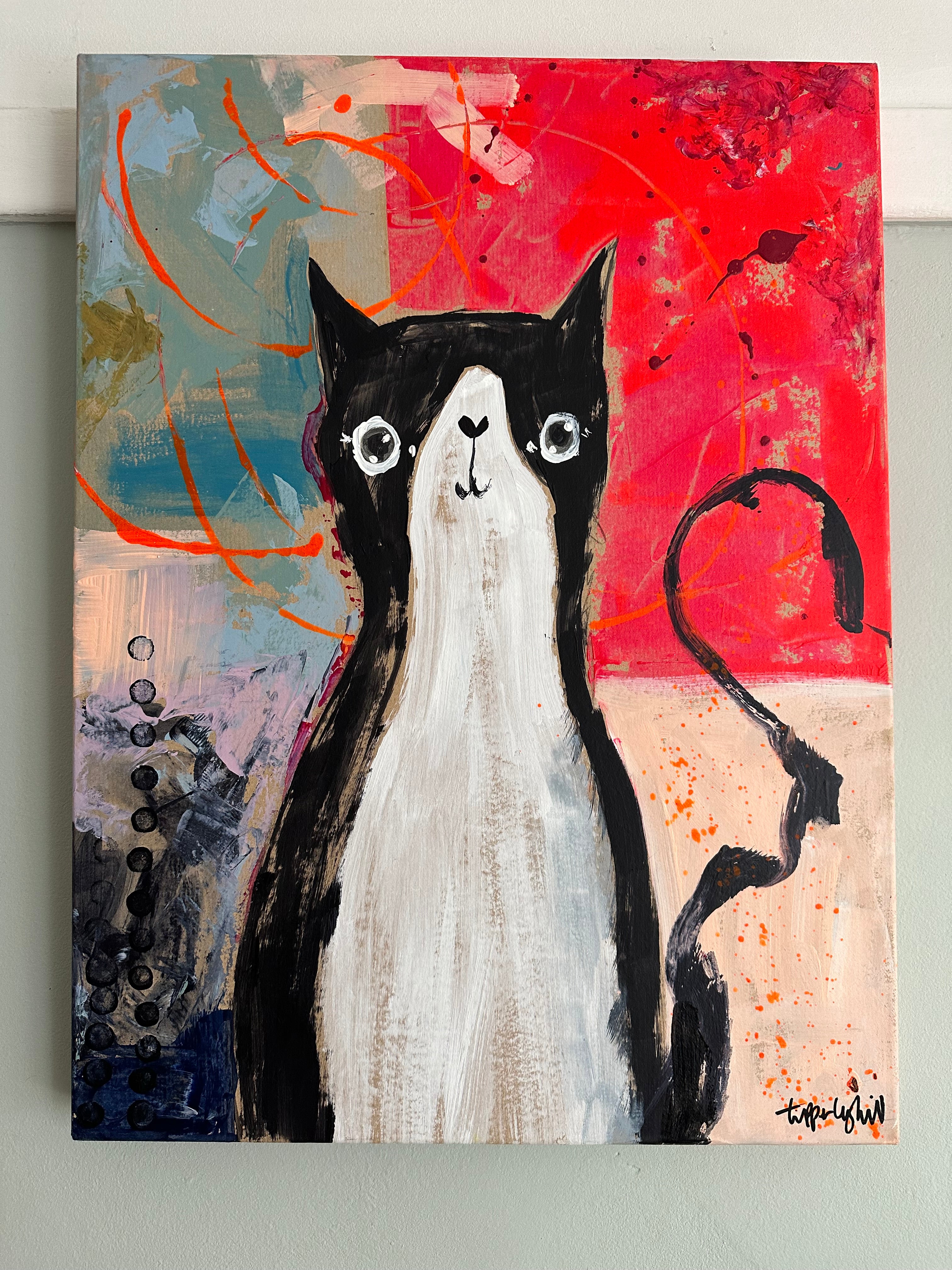 Cat portrait ’Beau’ tuxedo cat acrylic and mixed media on 18” x 24” deep edged canvas