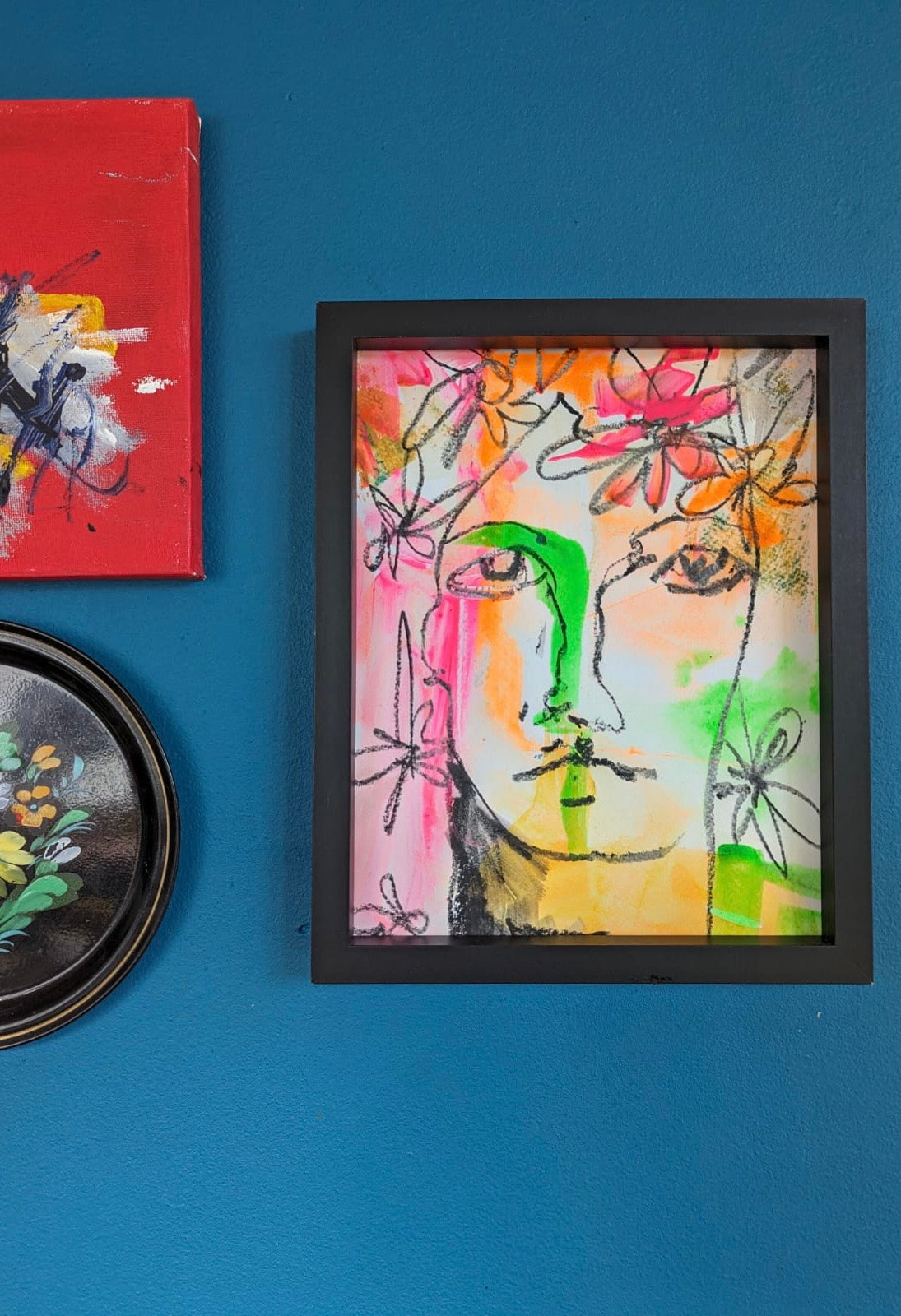 Watercolour paper, acrylic inks, pencils, pastels and a frame