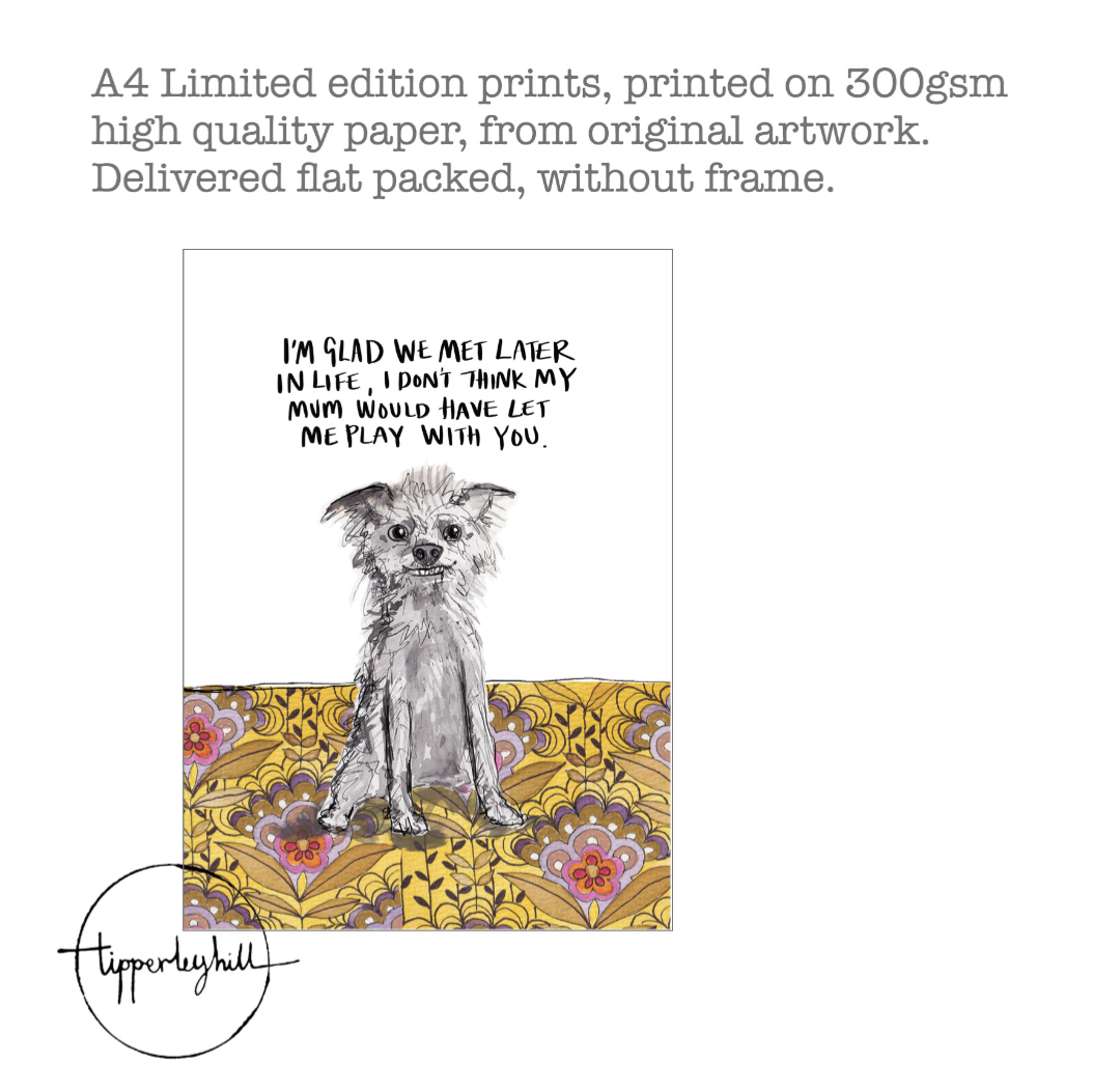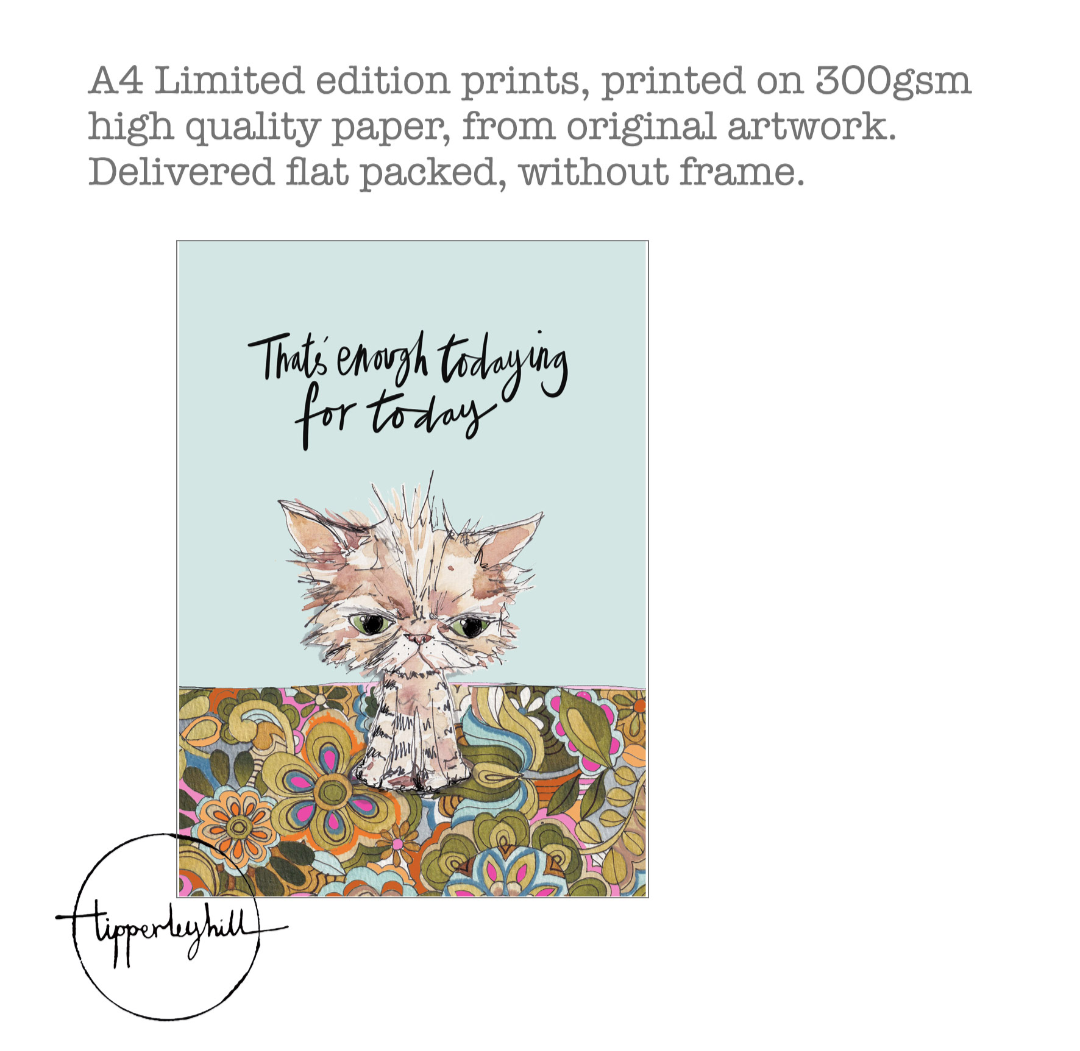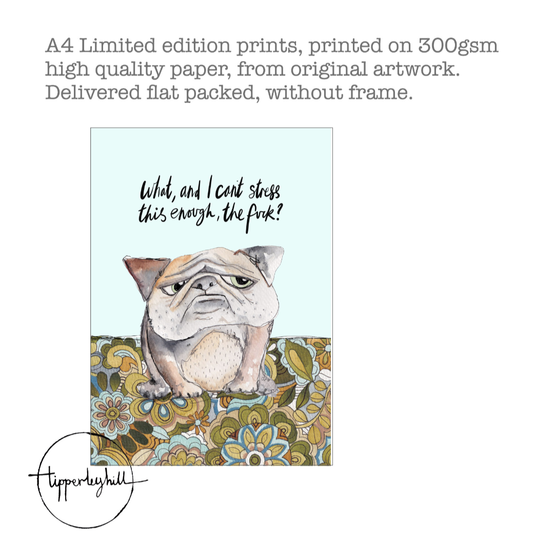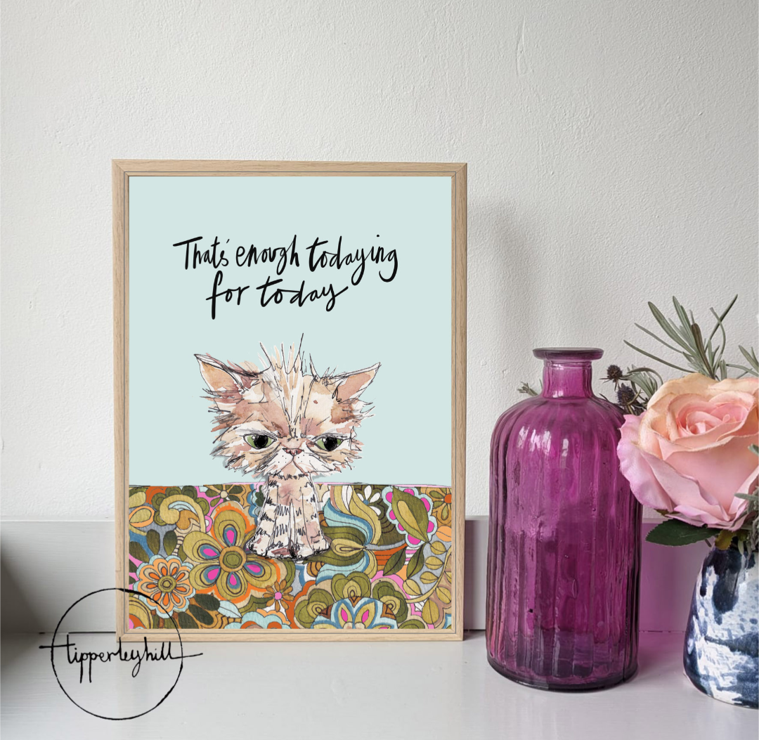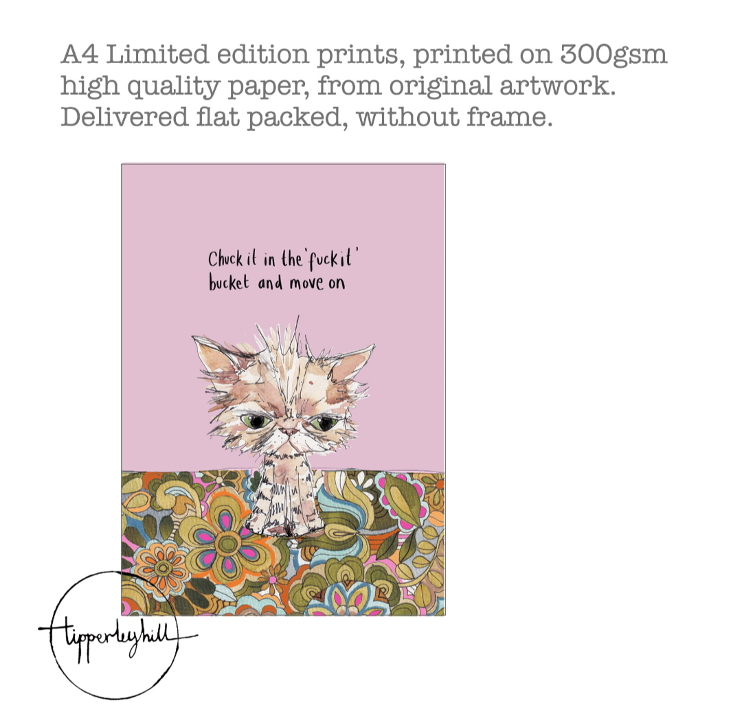 Choose from 30 different animal prints with pre printed phrases. Packed in a bio cello wrap with a cardboard back. No mount. These high quality giclee prints have the printed phrases shown in picture. These prints come unframed but will slot into a shop bought frame A4 size.
