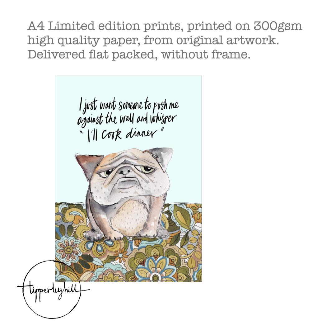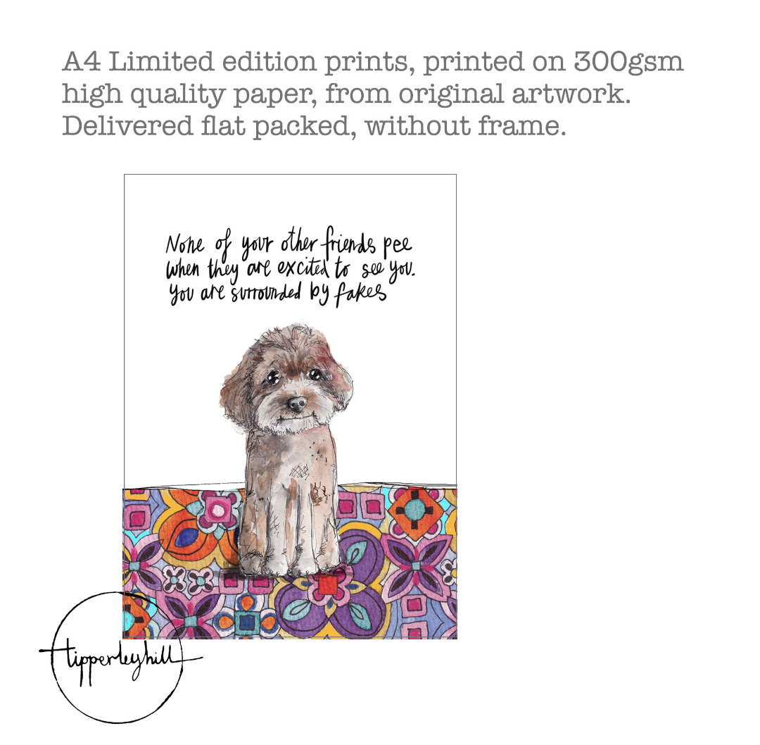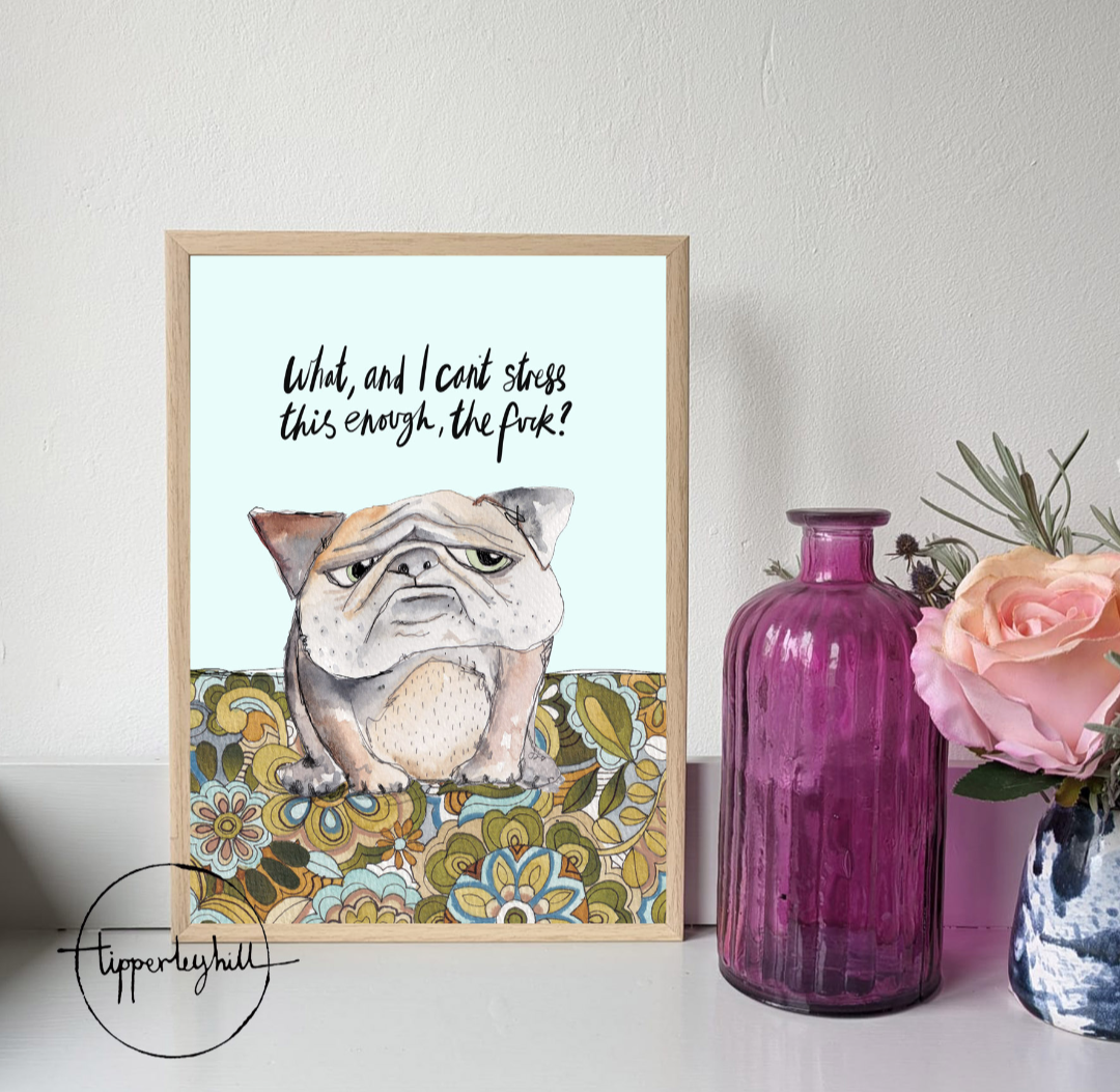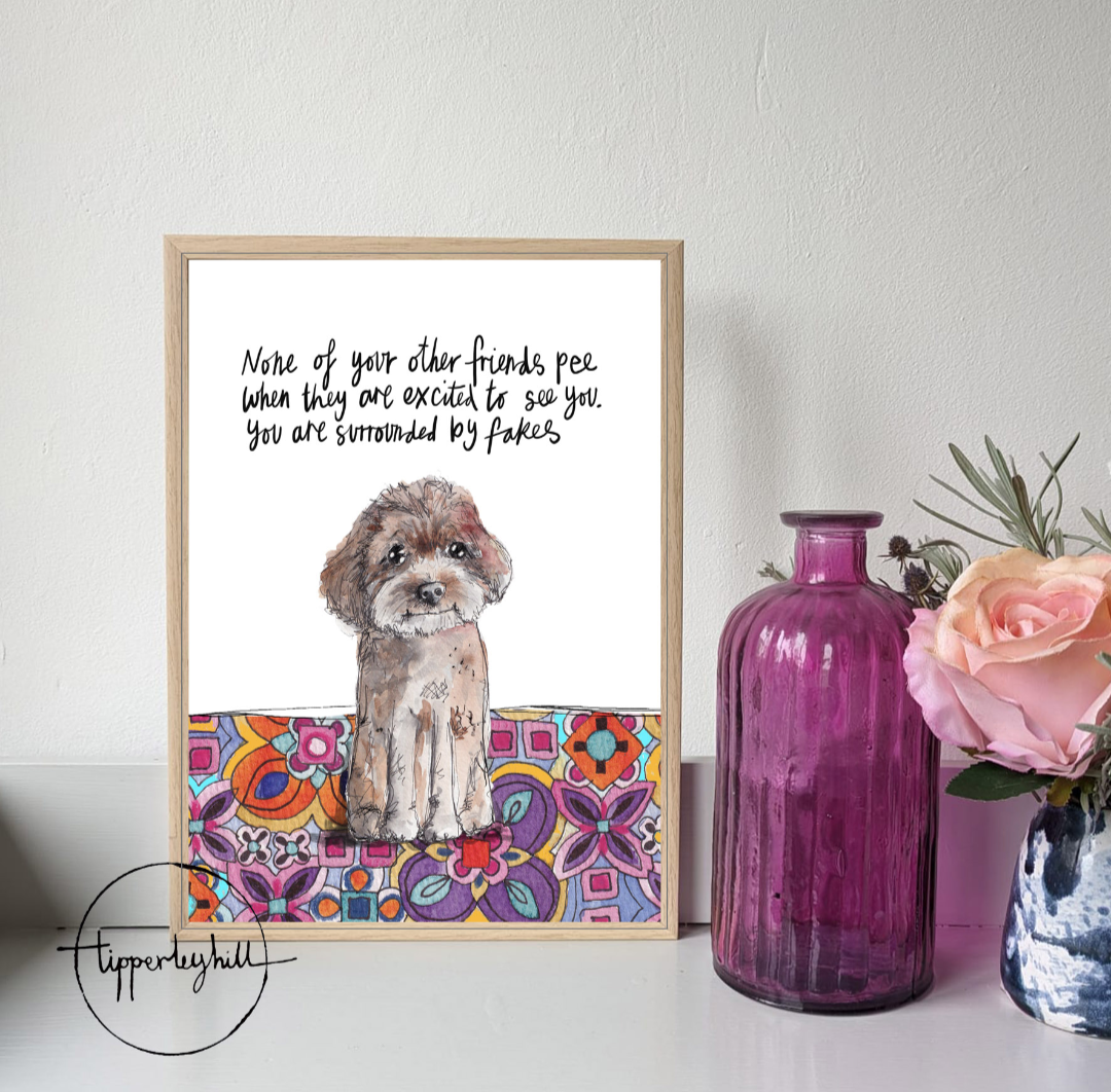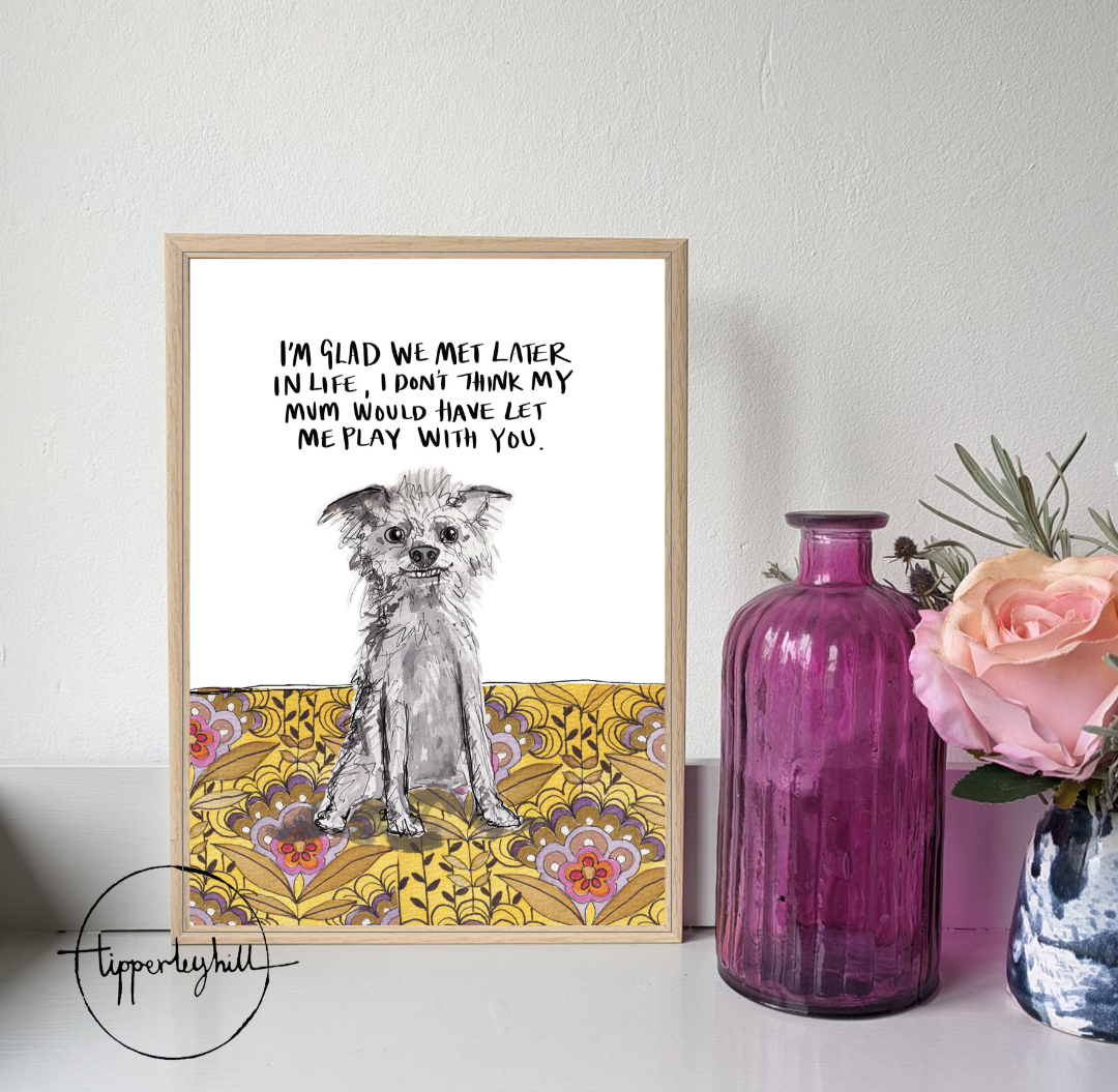 Choose from 30 different animal prints with pre printed phrases. Packed in a bio cello wrap with a cardboard back. No mount. These high quality giclee prints have the printed phrases shown in picture. These prints come unframed but will slot into a shop bought frame A4 size.