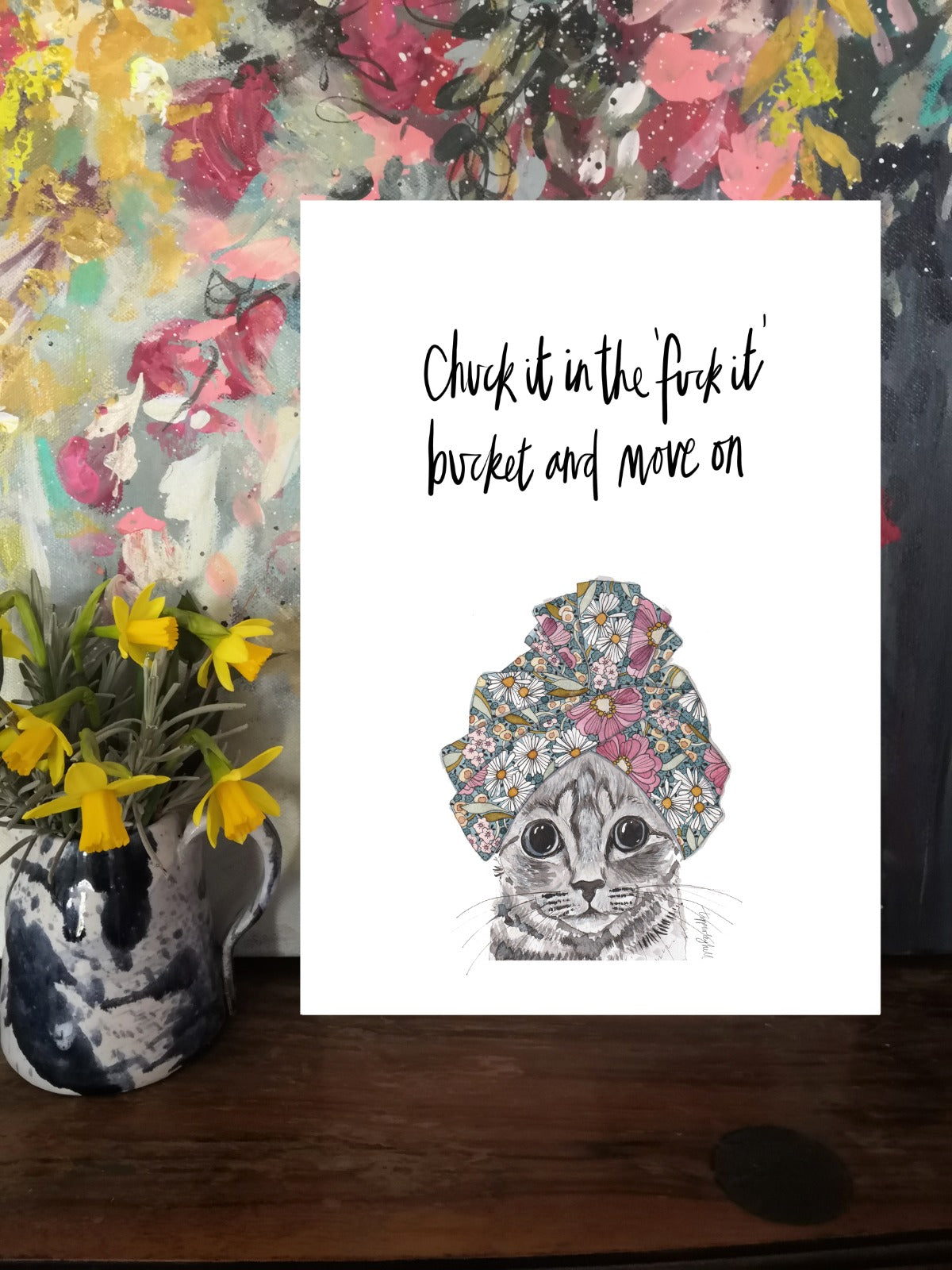 A4 print of Kevin cat with ‘Chuck it in the fuck it bucket and move on’.