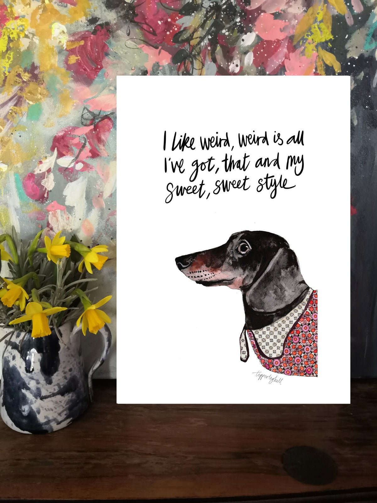 Printed quote animal print. A4 Ronnie the sausage dog ’I like weird, weird is all I’ve got, that and my sweet, sweet style’