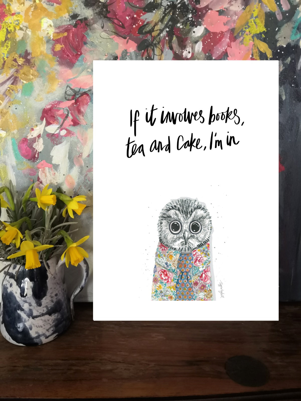 A4 print of Oscar owl print ‘If it involves books, tea and cake, I’m in’