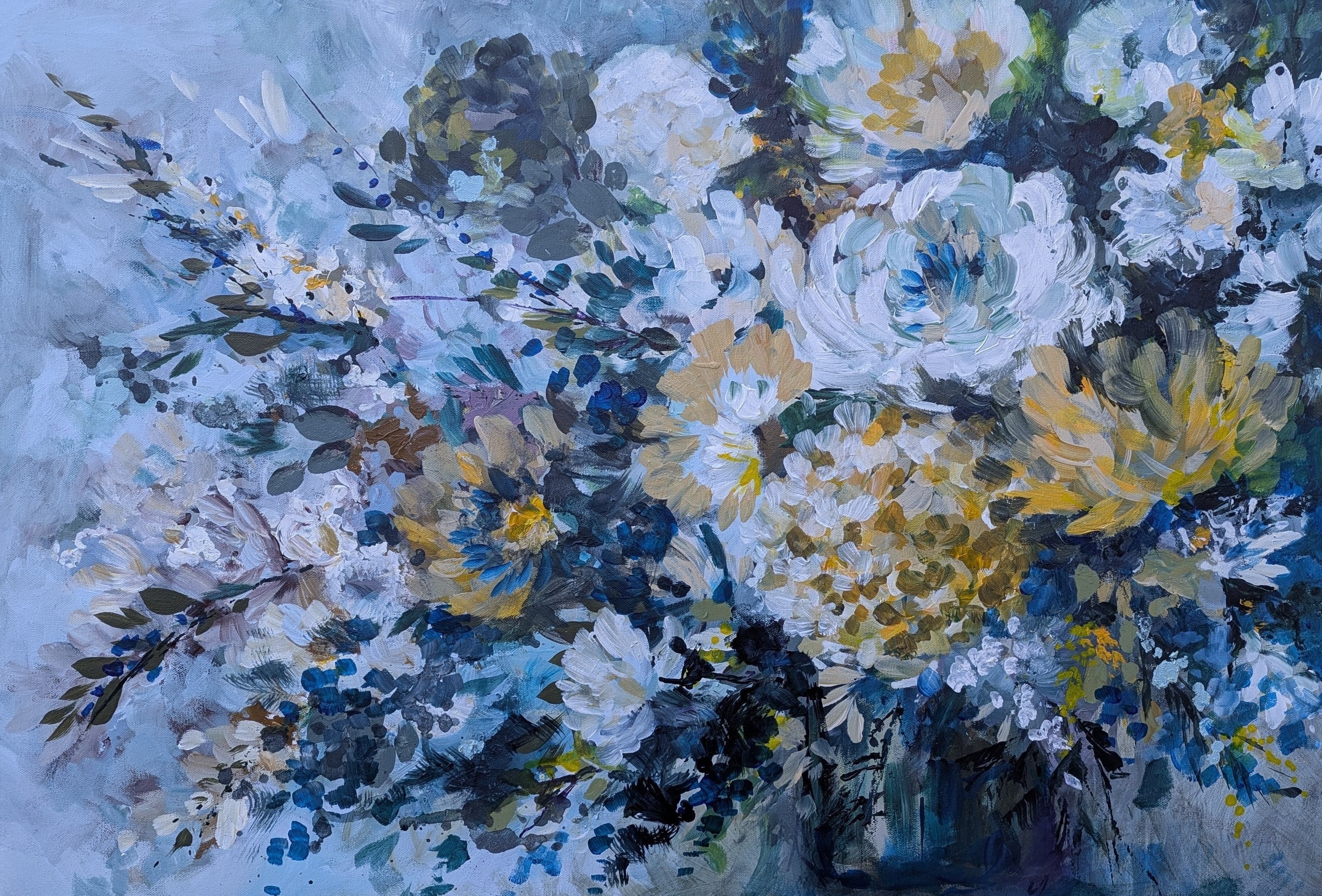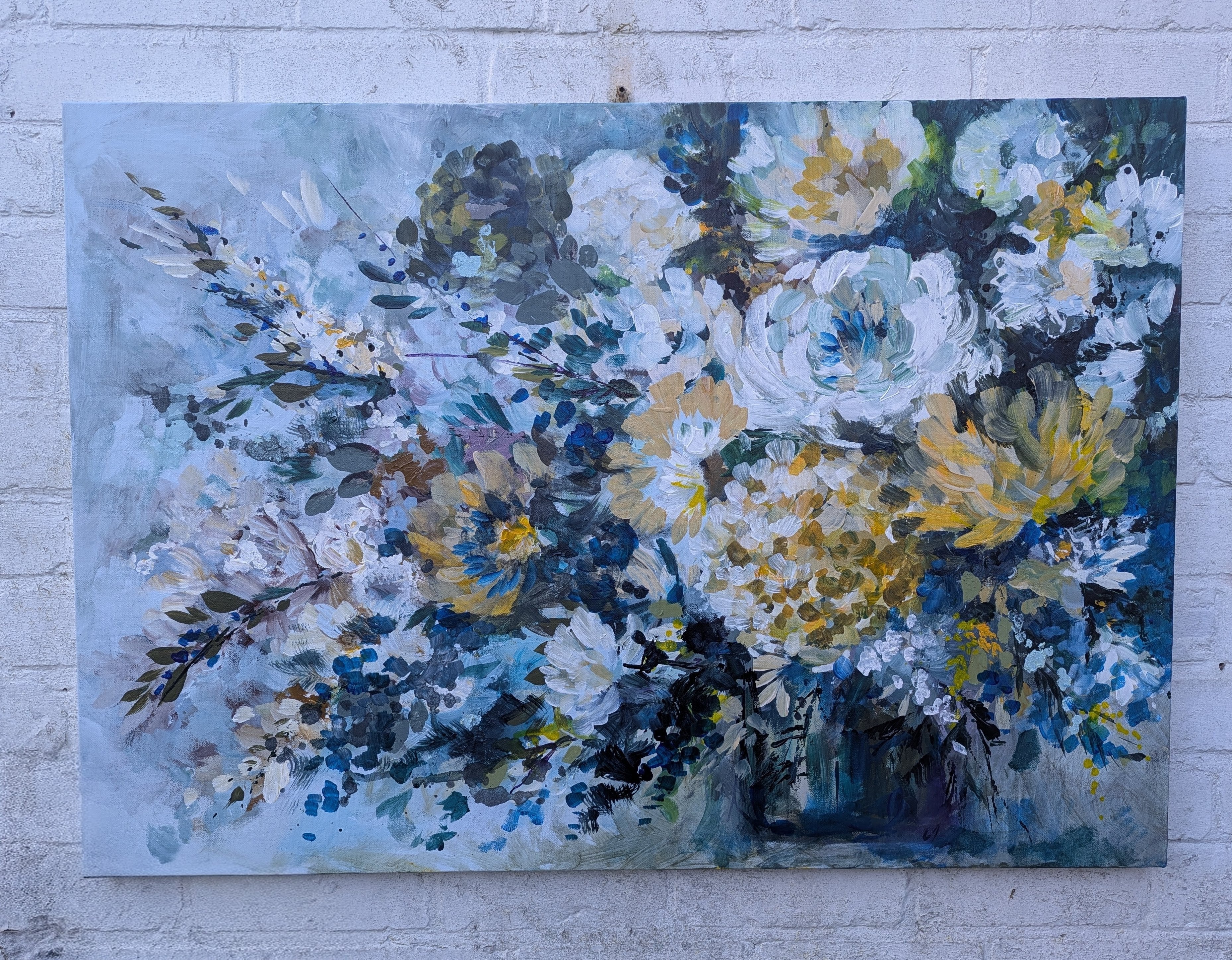Roz and Abi both work on these abstract floral pieces, both painting on the canvas and moving from piece to piece, creating layers in their individual techniques and styles. This unique way of working gives these paintings their fabulous style.
