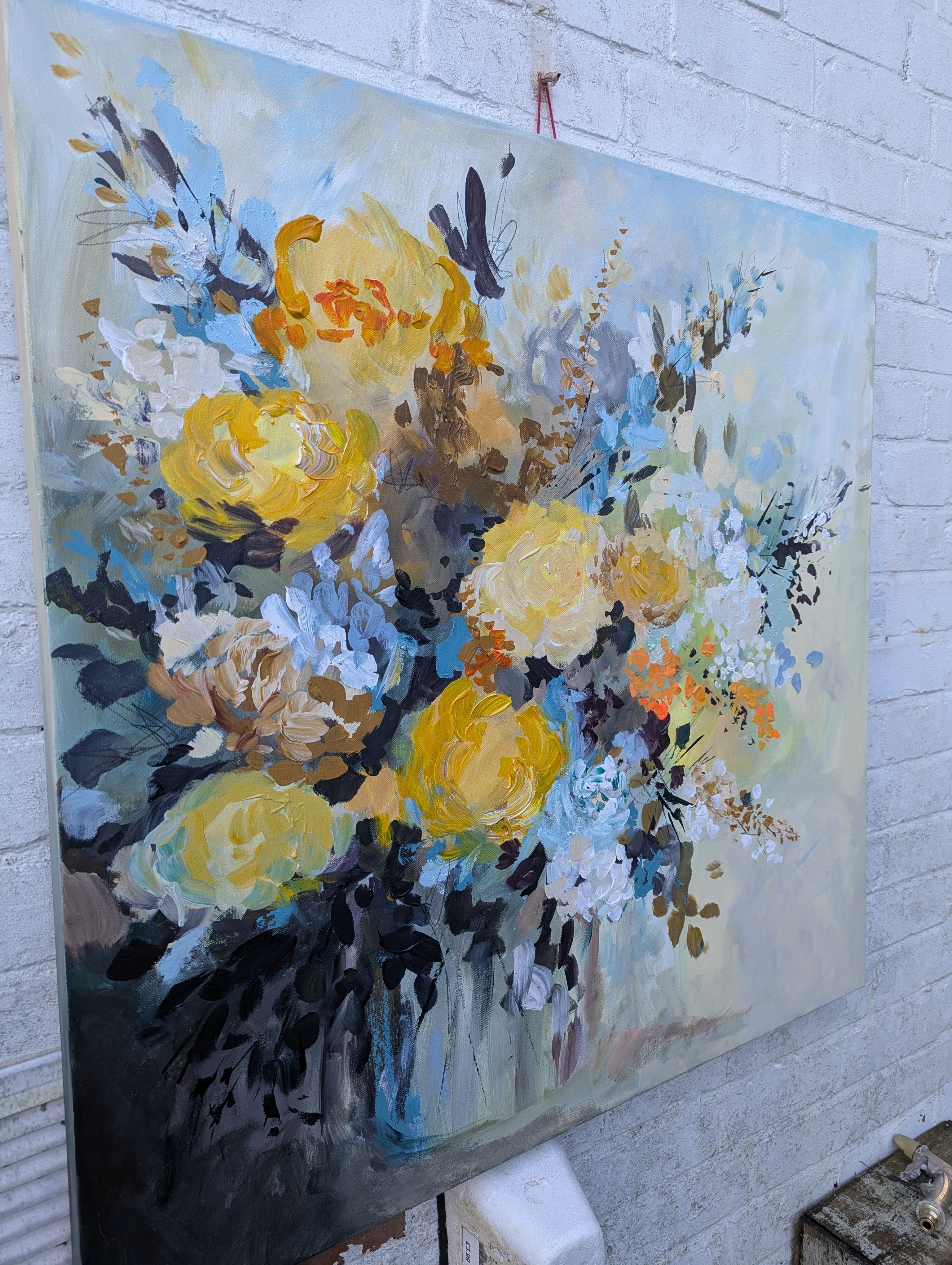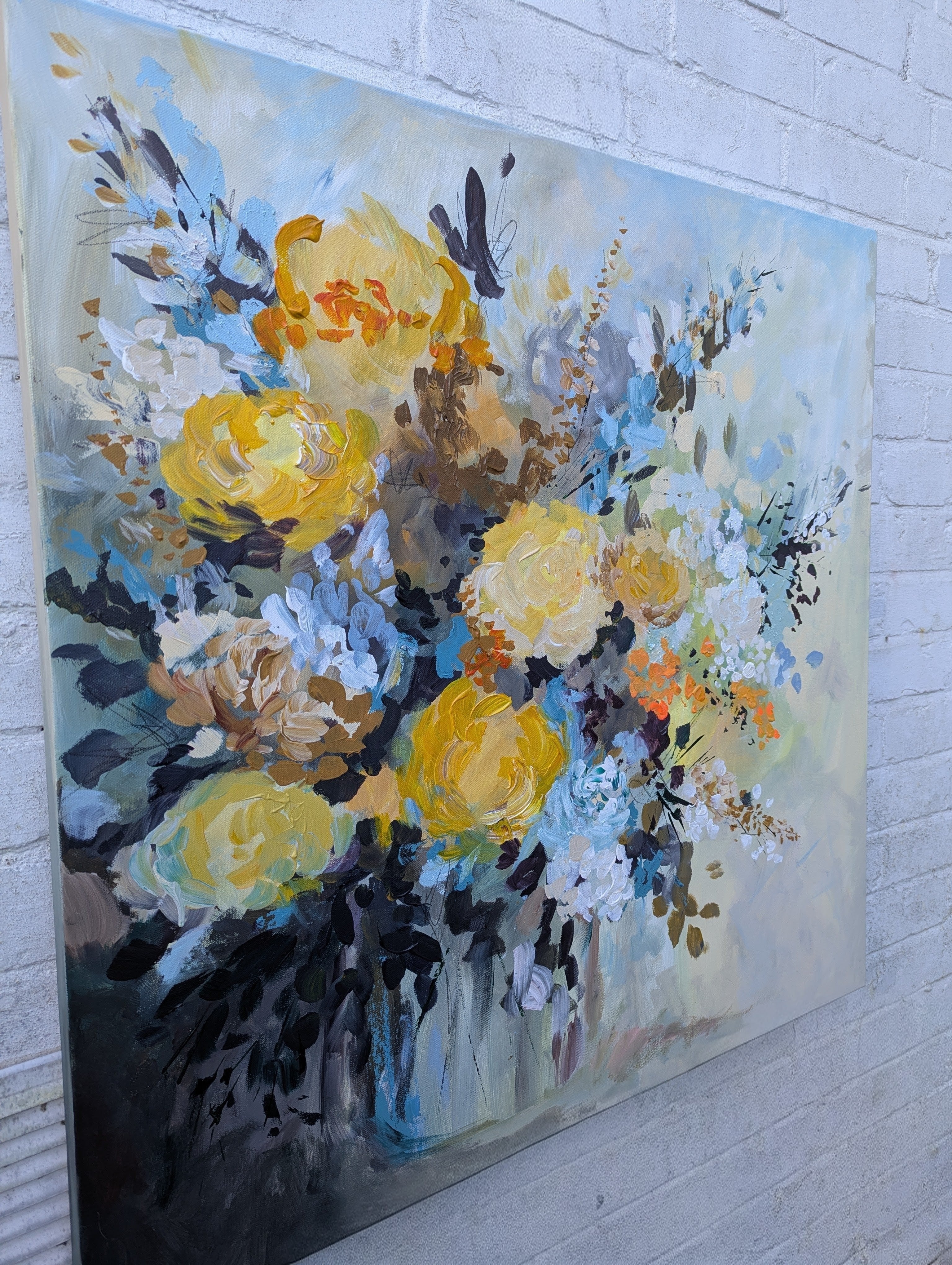 Abstract floral, ‘Yellow in love’, acrylic and mixed media on canvas, 100 x 100cm on deep edged canvas