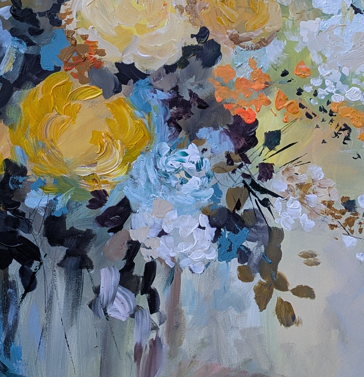 Roz and Abi both work on these abstract floral pieces, both painting on the canvas and moving from piece to piece, creating layers in their individual techniques and styles. This unique way of working gives these paintings their fabulous style.