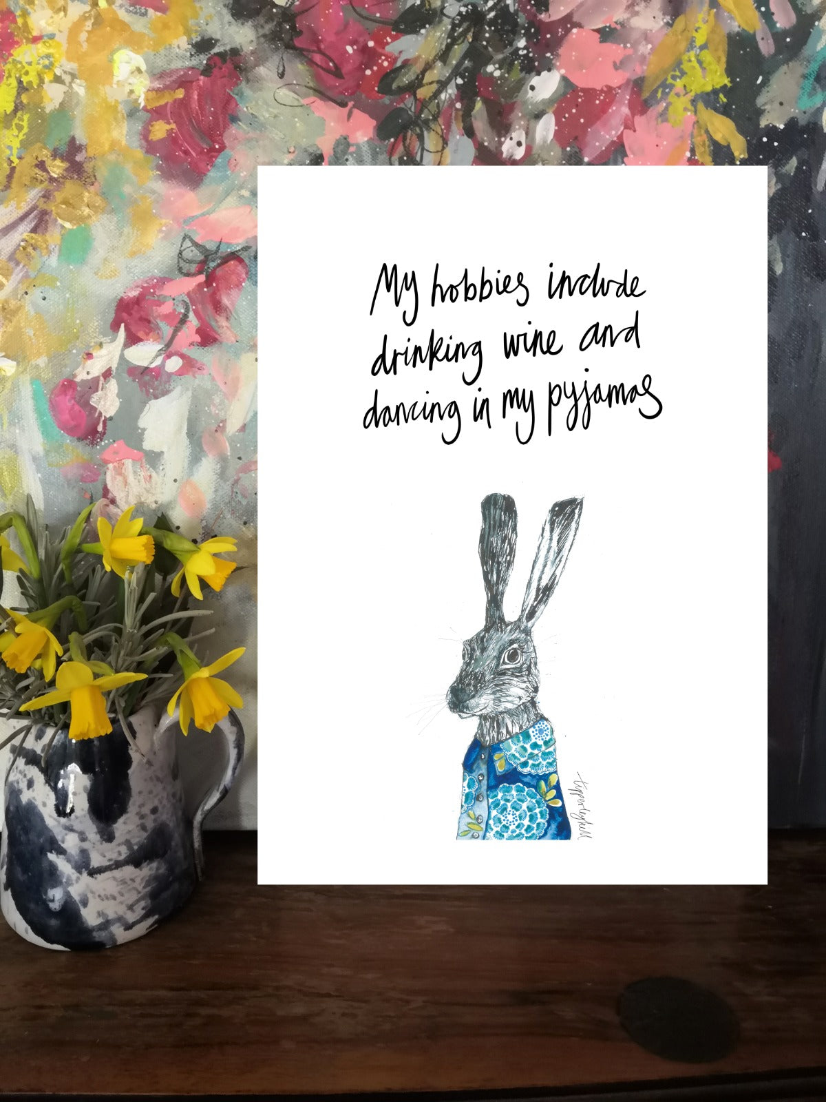 A4 Walter the hare print ‘My hobbies include drinking wine and dancing in my pyjamas’